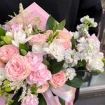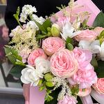 White freesia - 5 pcs astilbe - 3 pcs matthiola - 3 pcs bush dianthus - 3 pcs pink bush rose - 5 pcs envelope box - 1 pcs