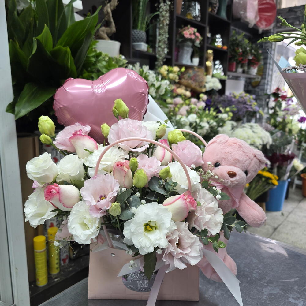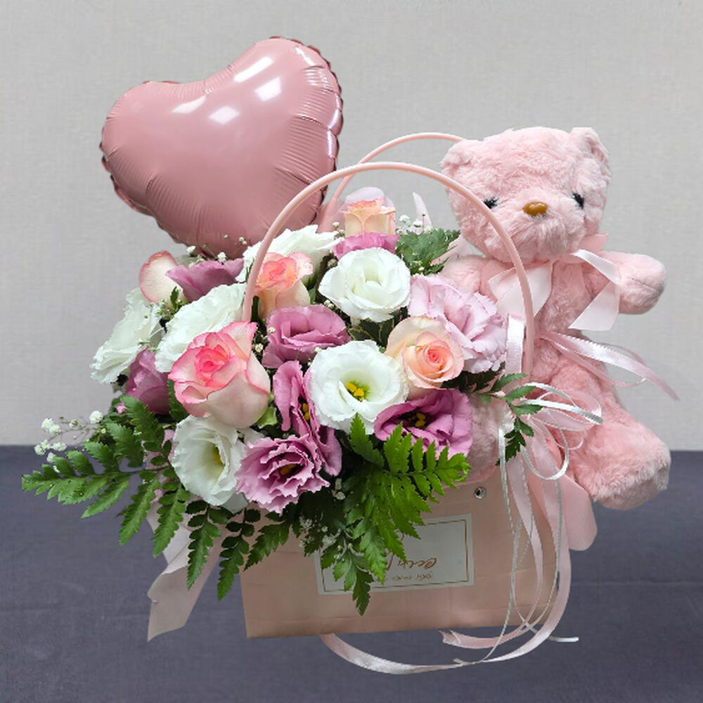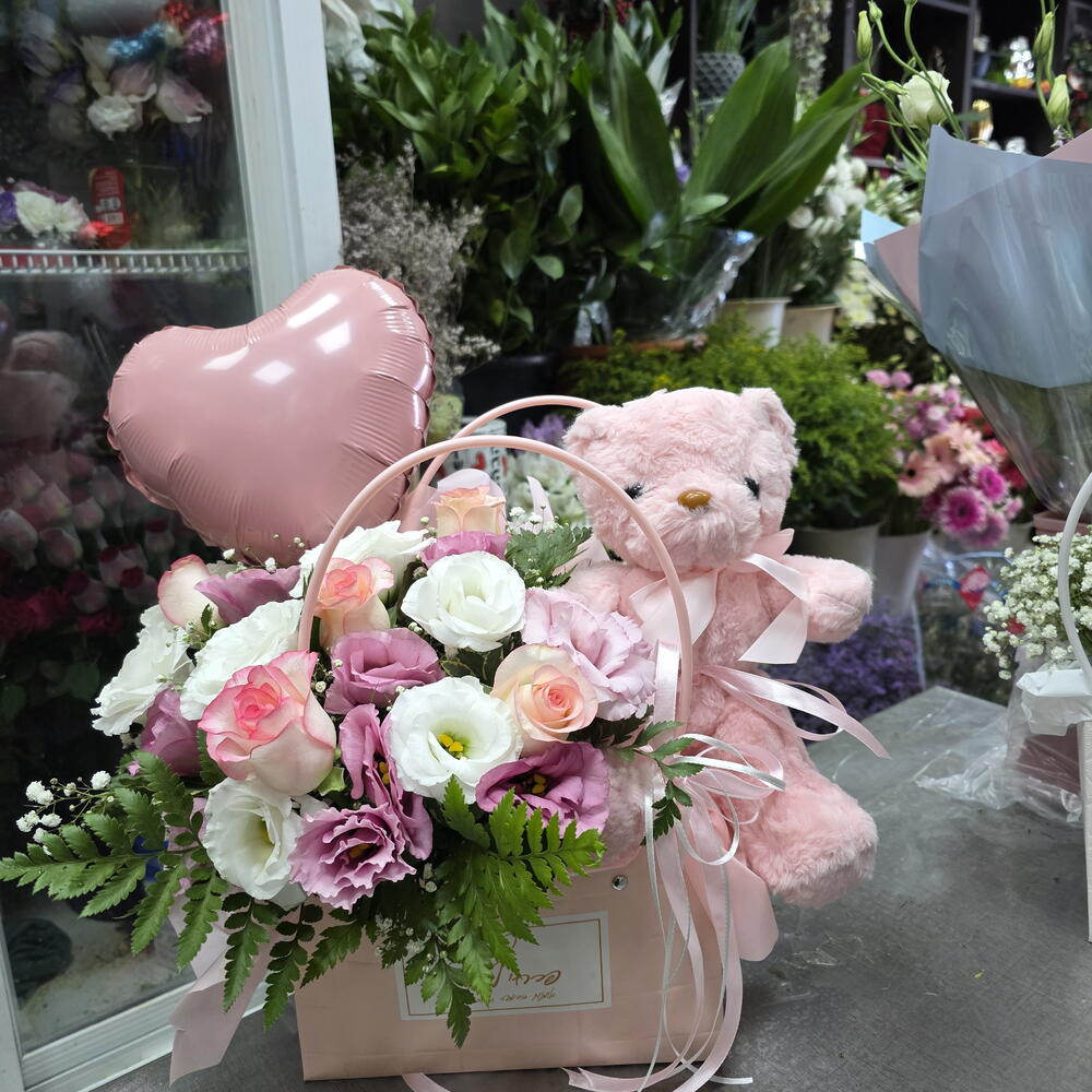 ירק - 10 pcs ורדים ורודים - 5 pcs חרצית לבנה - 7 pcs בלון ללא גז - 1 pcs דובי ורוד - 1 pcs תיק ורוד - 1 pcs ליזיאנטוס ורוד - 1 pcs לבן - 1 pcs