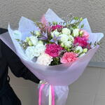 Eustoma - 1 pcs Limonium - 1 pcs Clematis - 1 pcs astilbe - 1 pcs rose - 3 pcs eucalyptus - 2 pcs carnation - 6 pcs decorative paper - 1 pcs spey rose - 1 pcs