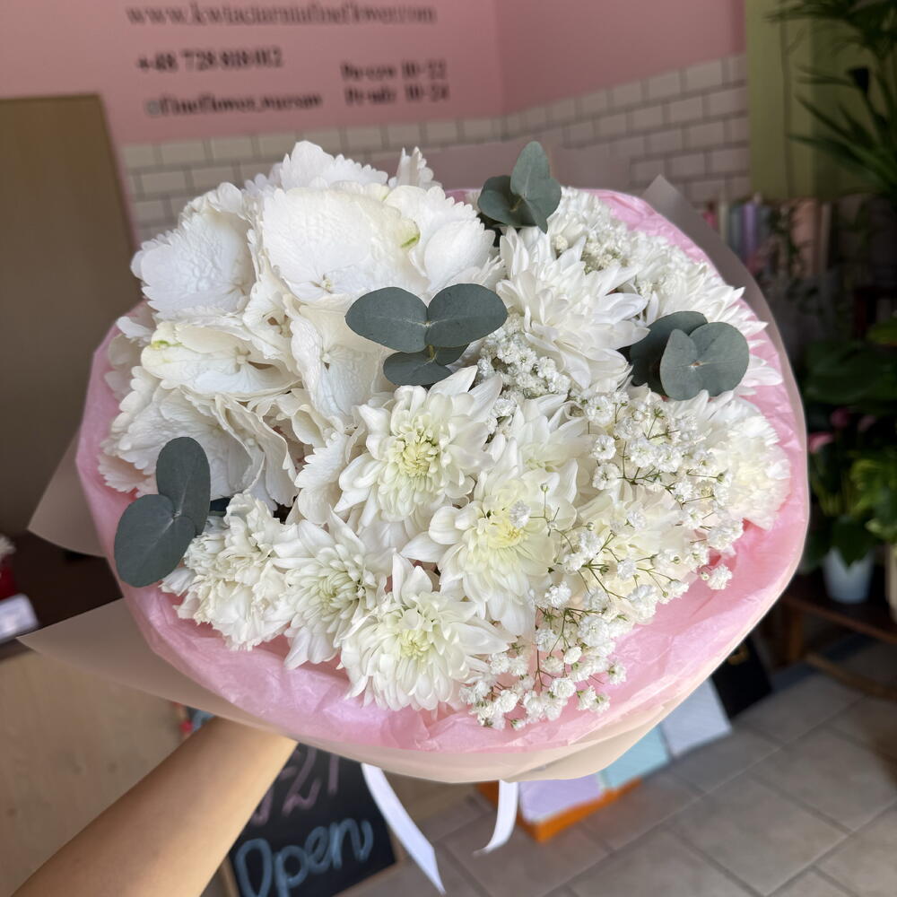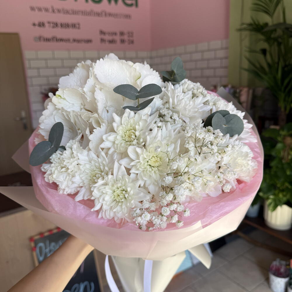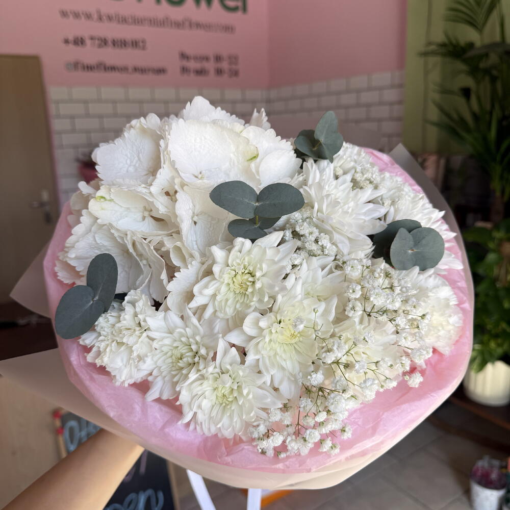 gypsophila - 1 pcs hydrangea - 1 pcs eucalyptus - 2 pcs carnation - 5 pcs daisy - 2 pcs