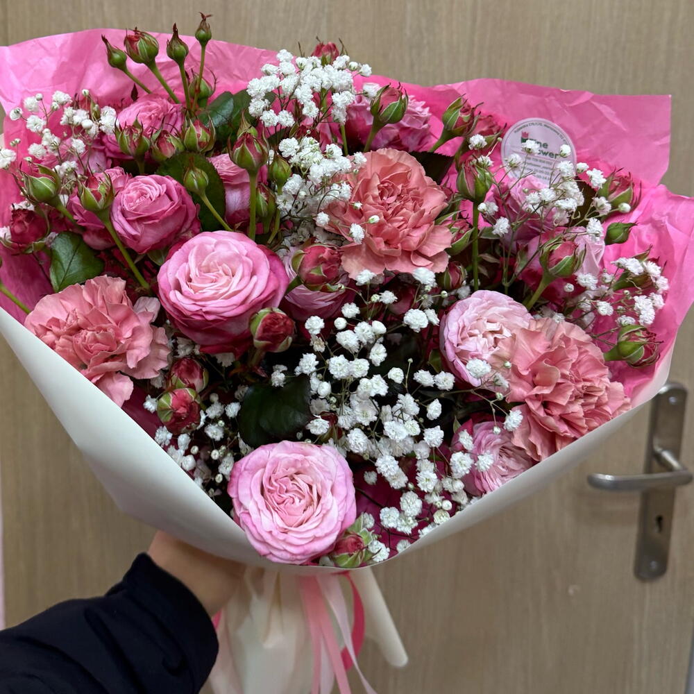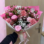 gypsophila - 1 pcs spray rose - 3 pcs carnation - 3 pcs decorative paper - 1 pcs