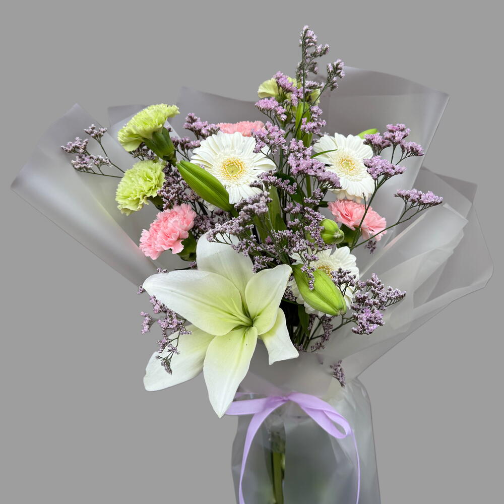 Limonium - 2 pcs Gerbera - 3 pcs lilies - 2 pcs carnation - 7 pcs
