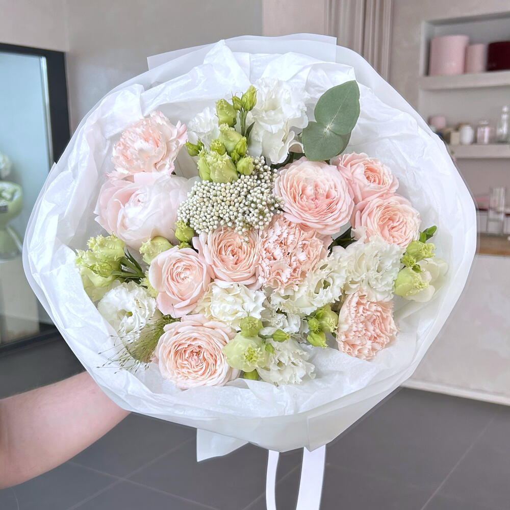 Eustoma - 3 pcs Eucalyptus - 1 pcs ozothamnus - 1 pcs spray rose - 2 pcs carnation - 4 pcs freesia - 1 pcs peony - 1 pcs millet - 1 pcs