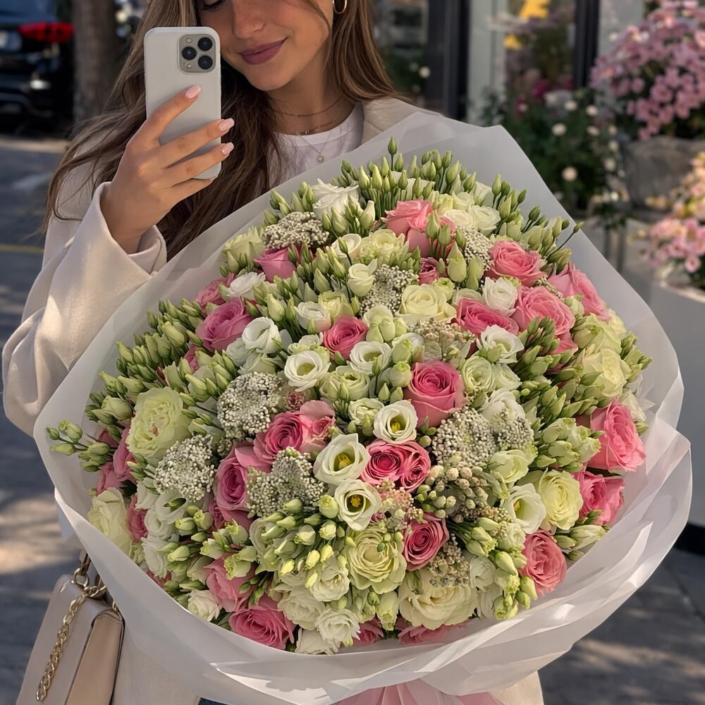 Eustoma - 30 pcs white rose - 20 pcs pink rose - 10 pcs ozathamnus - 10 pcs