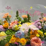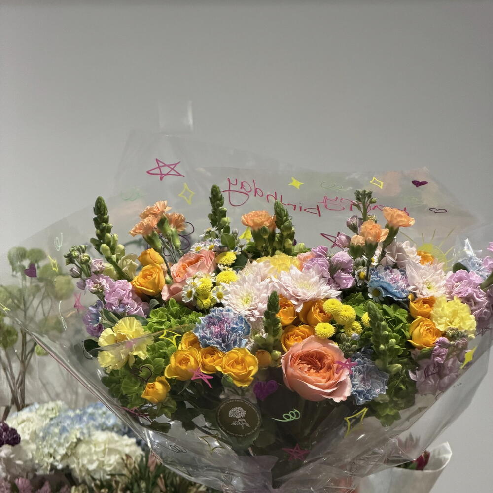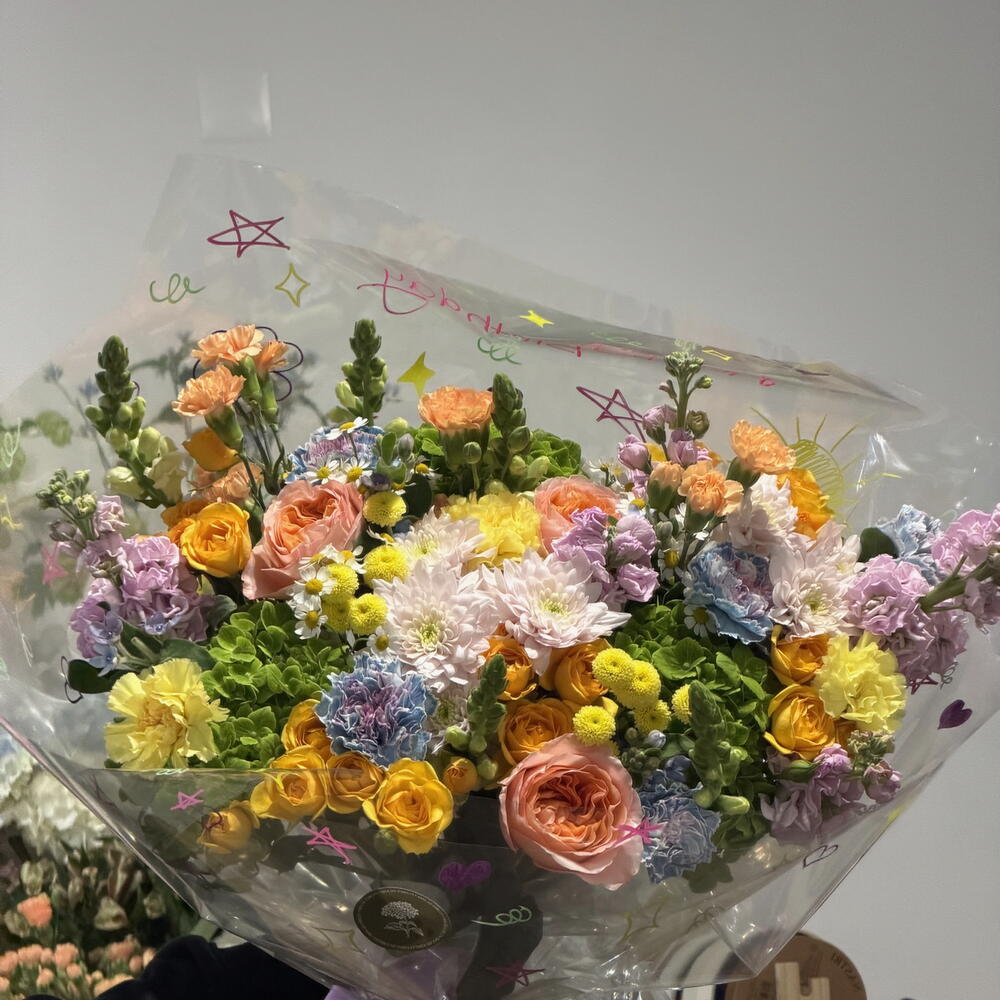 carnation - 8 pcs snapdragon - 5 pcs tanacetum spray daisy - 2 pcs green hydrangea - 3 pcs alhelí - 4 pcs peach roses - 3 pcs yellow spray roses - 5 pcs tanacentum yellow - 2 pcs pink crisântemos - 2 pcs peach small carnations - 3 pcs