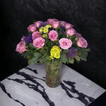 Hermoso arreglo floral, compuesto de rosas lila y hermosos follajes Ideal para decorar y brindarle un toque de naturaleza a cualquier espacio.