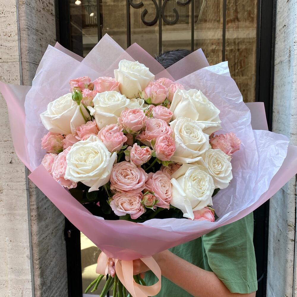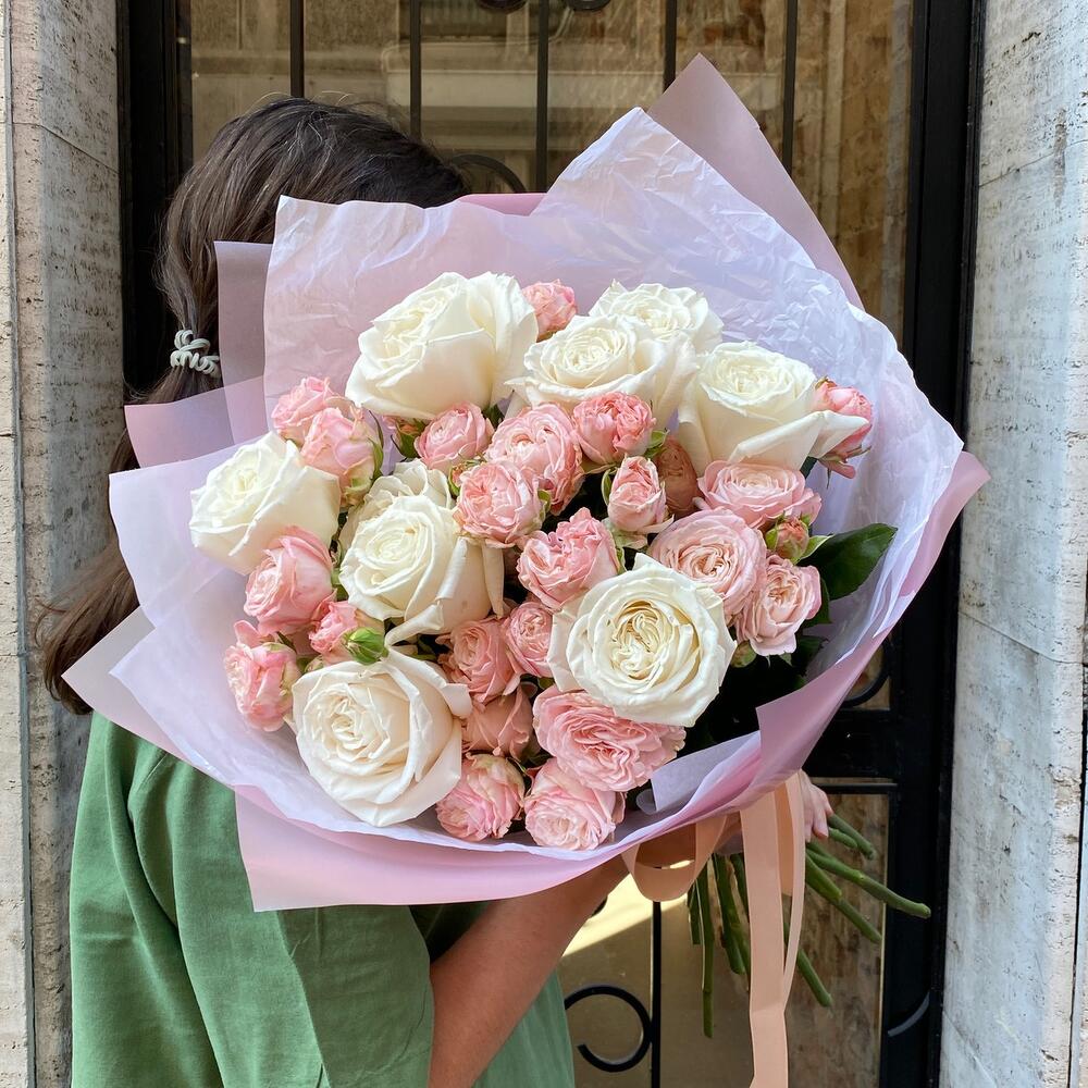 white beach - 8 pcs packaging design - 3 pcs ribbon satin - 1 pcs bombastic spray rose - 9 pcs