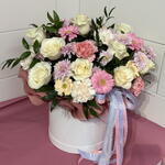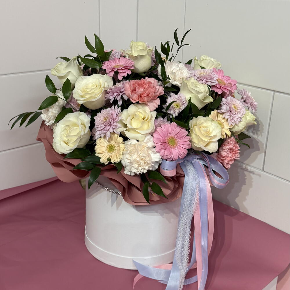 Gerbera - 6 pcs Ruskus - 3 pcs rose - 15 pcs carnation - 13 pcs daisy - 5 pcs box - 1 pcs floral foam - 1 pcs