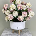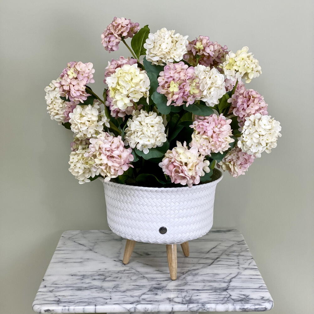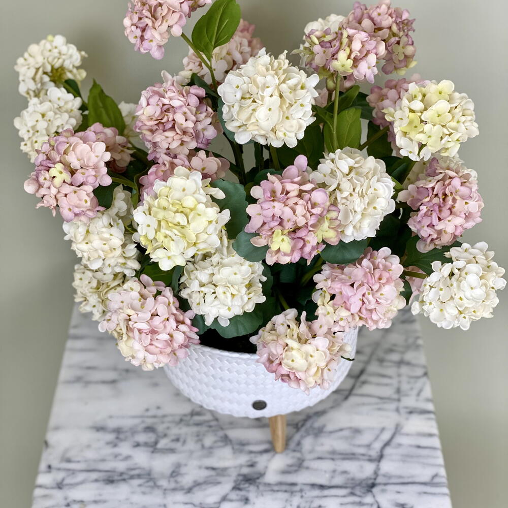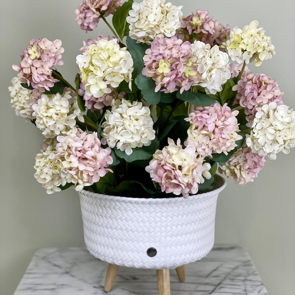 Ein hochwertiges kunstliches Hortensien-Arrangement in einem Rattantopf