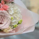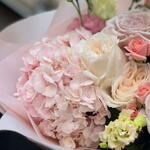 Eustoma white - 3 pcs cream rose - 5 pcs decorative greenery - 4 pcs ortensia - 2 pcs brush roses - 3 pcs