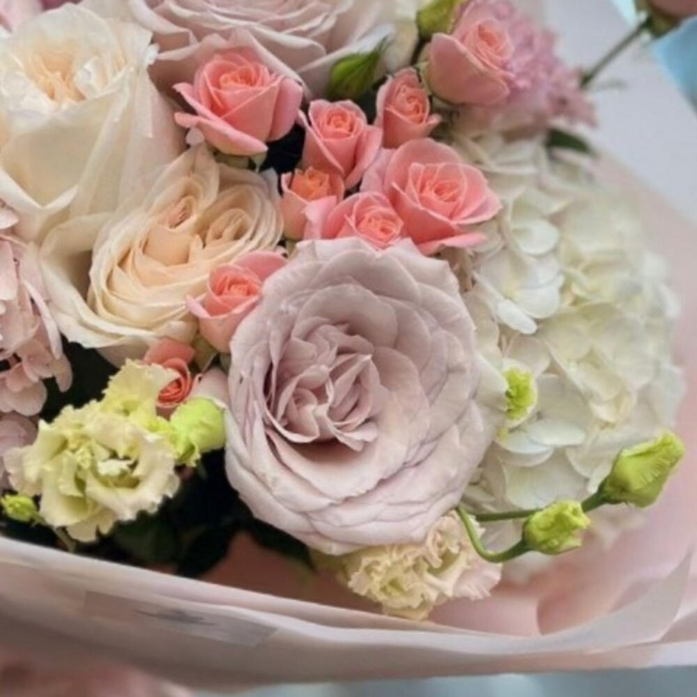 Eustoma white - 3 pcs cream rose - 5 pcs decorative greenery - 4 pcs ortensia - 2 pcs brush roses - 3 pcs