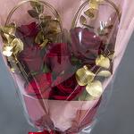 A hand bouquet of red roses