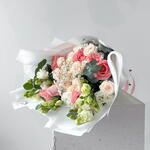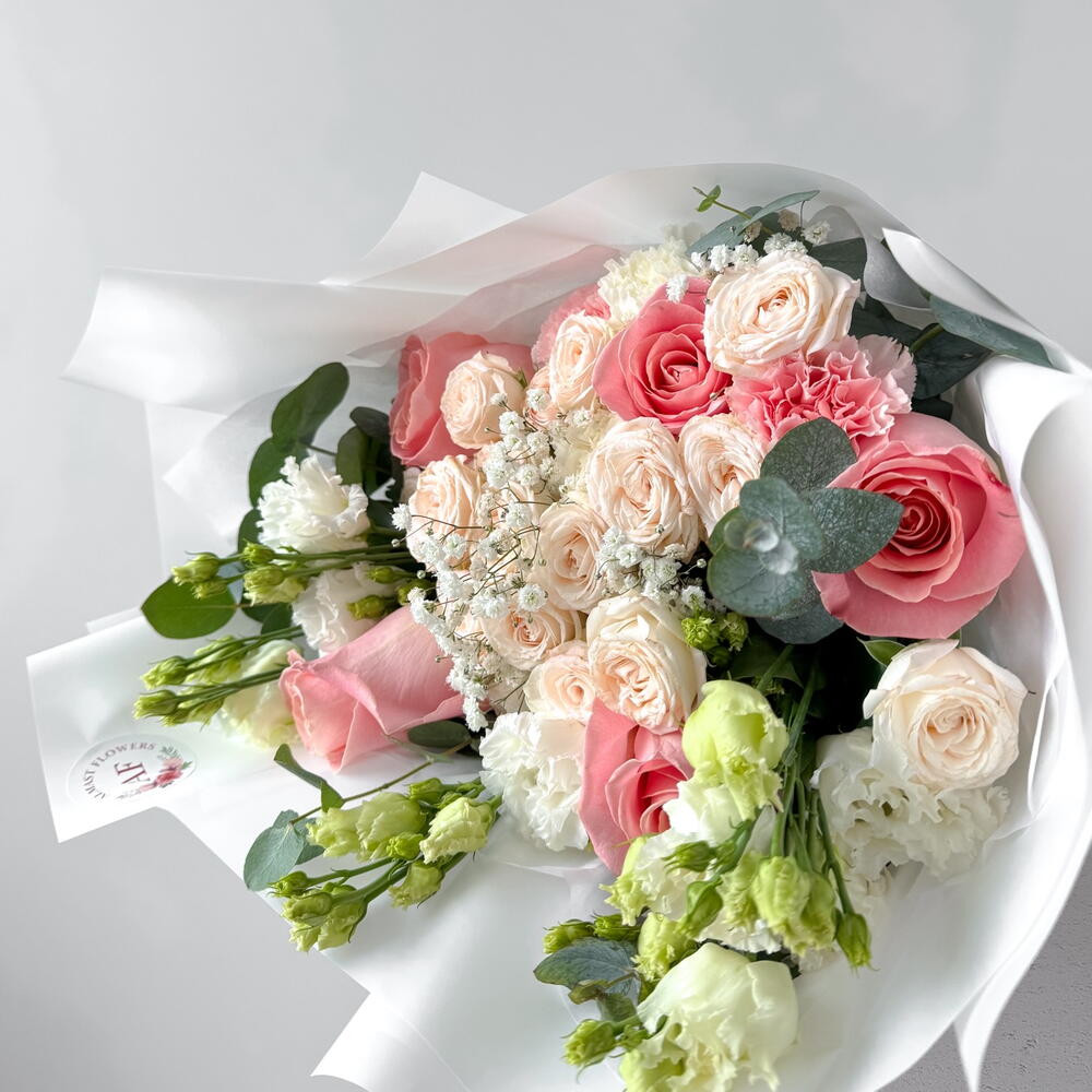 Eucalyptus - 7 pcs Eustoma white - 3 pcs dianthus - 5 pcs gypsophila white - 1 pcs spray roses - 4 pcs pink roses - 5 pcs