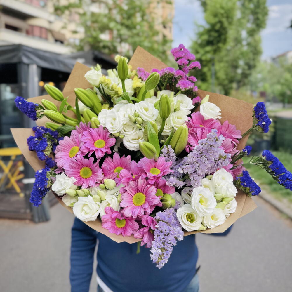 White lilies - 3 pcs lisianthus white - 10 pcs pink chrysanthemum - 5 pcs statices mix - 5 pcs