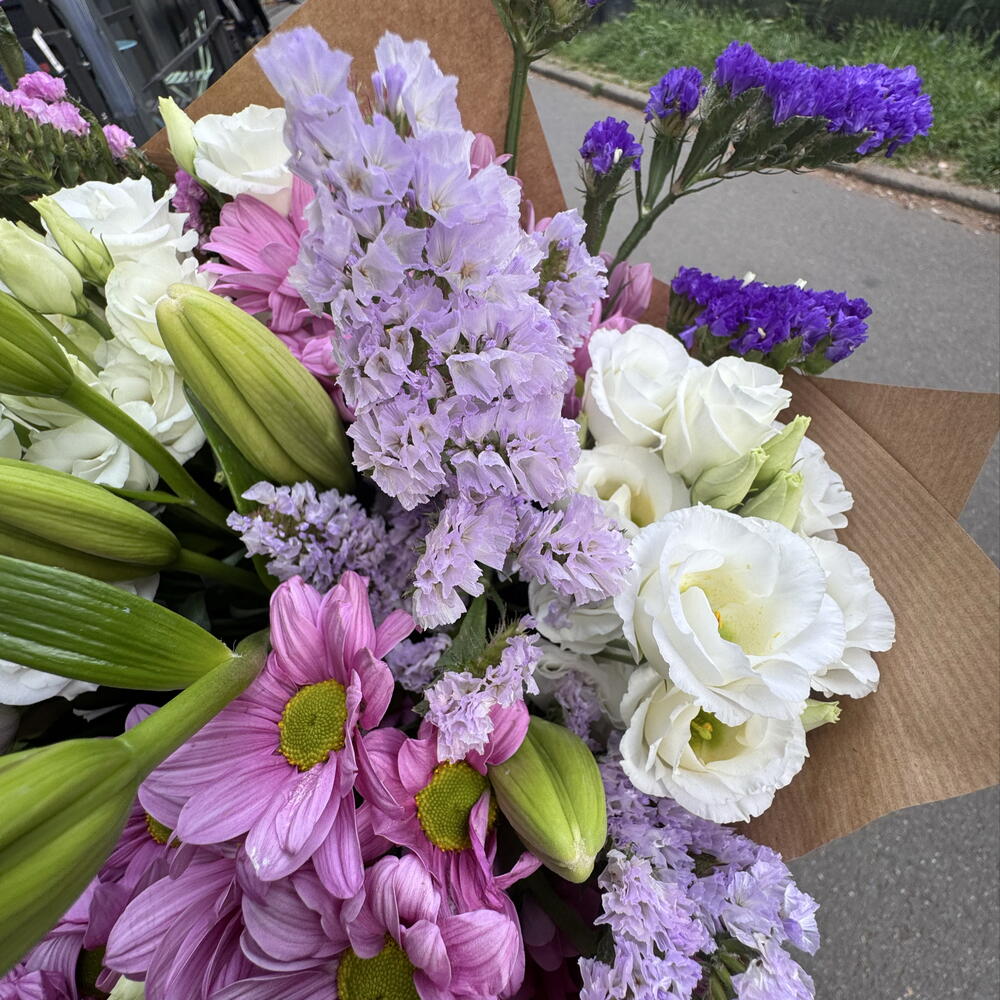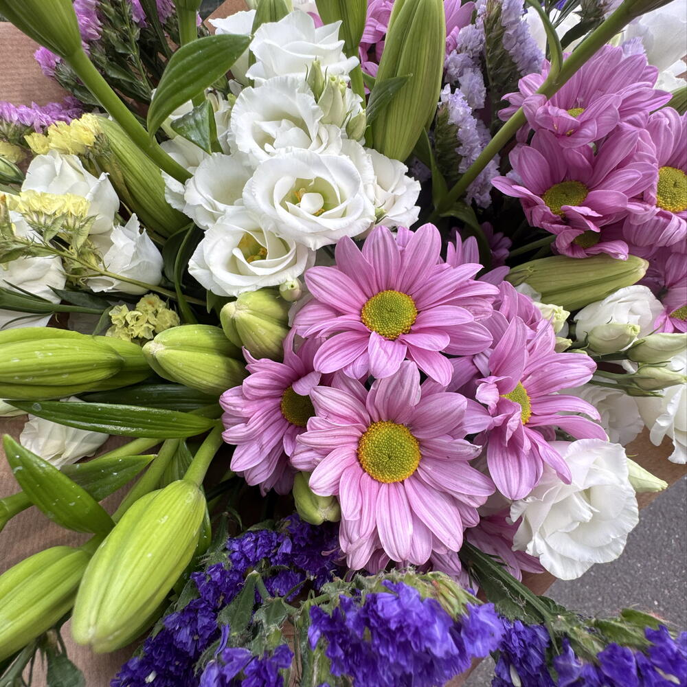 A bouquet made of mix blooms of white lisianthus, white lilies, pink chrysanthemums and statice.21