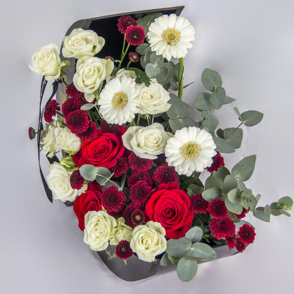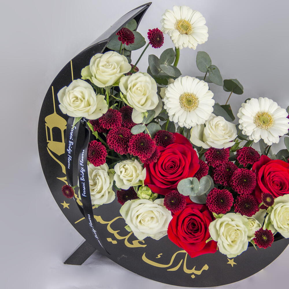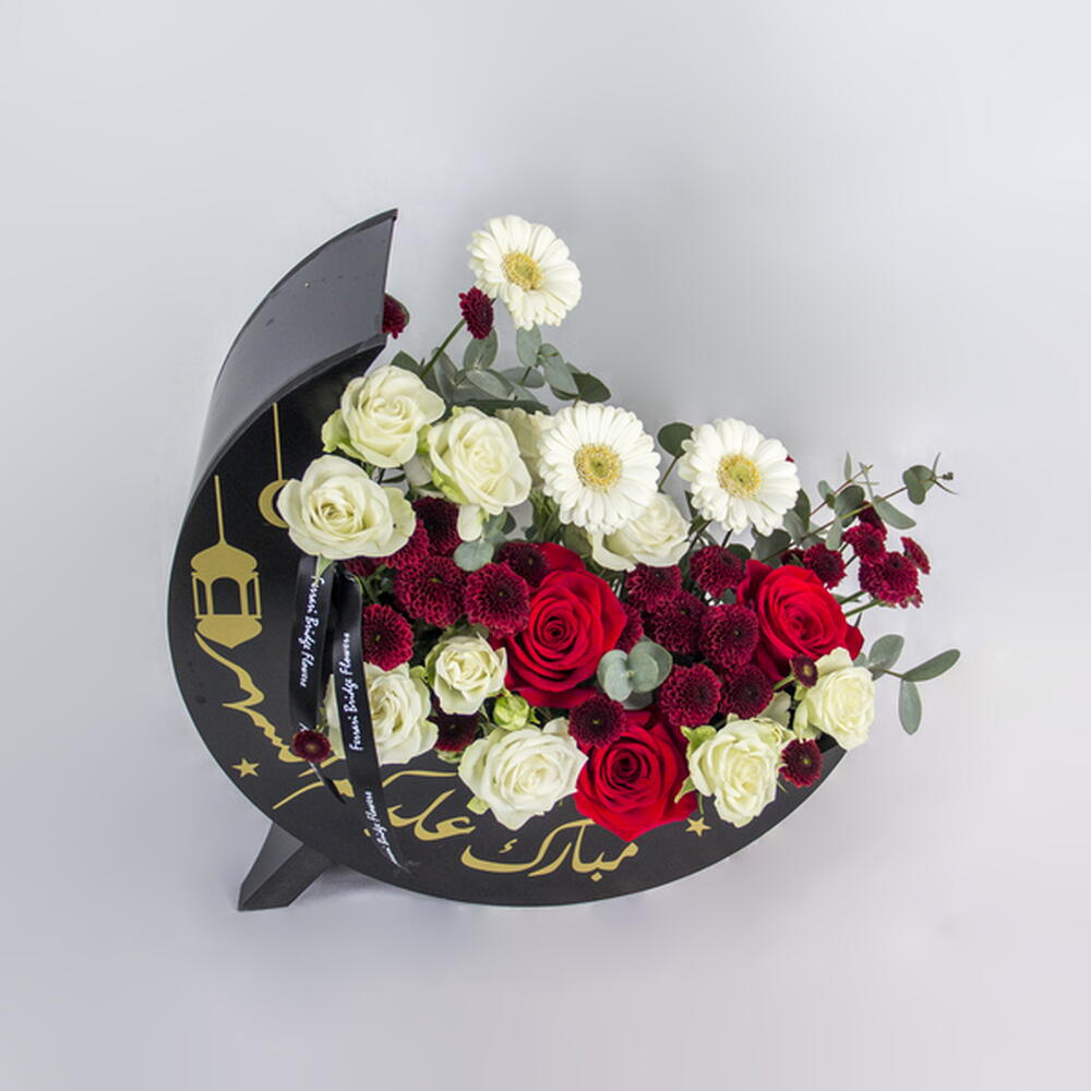 Chrysanthemum - 10 pcs Gerbera - 3 pcs roses - 3 pcs spray roses - 5 pcs moon shaped box with ramadan wishes - 1 pcs
