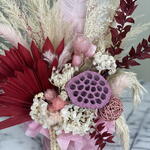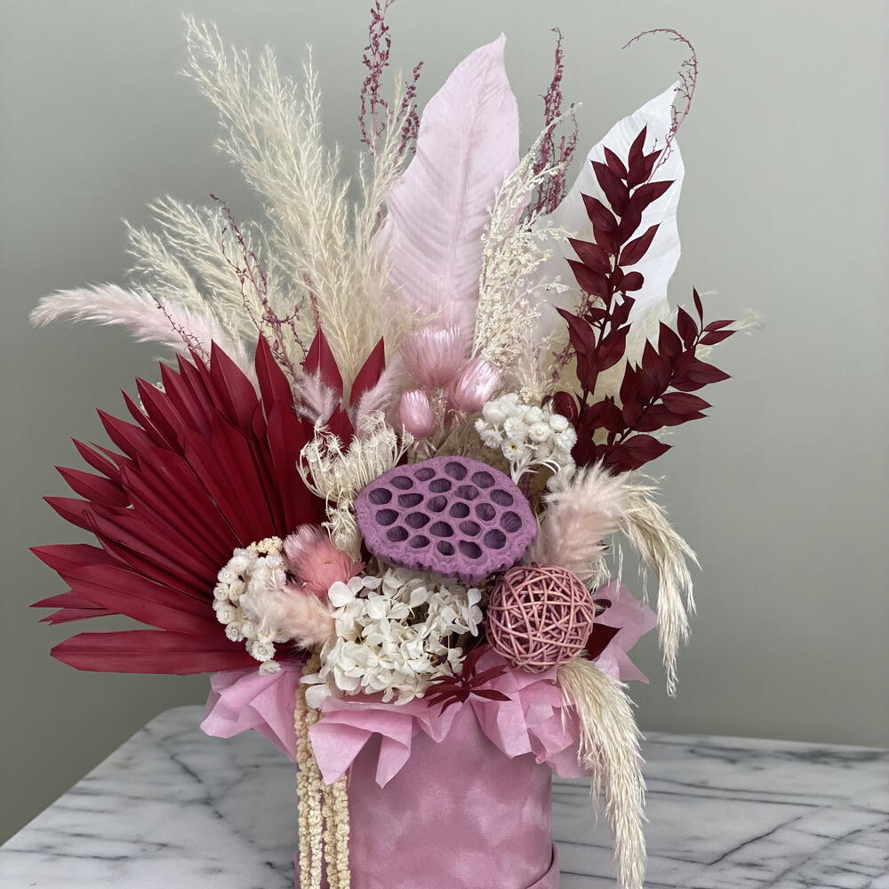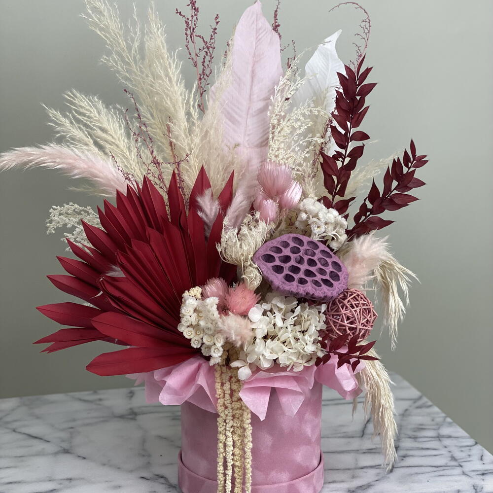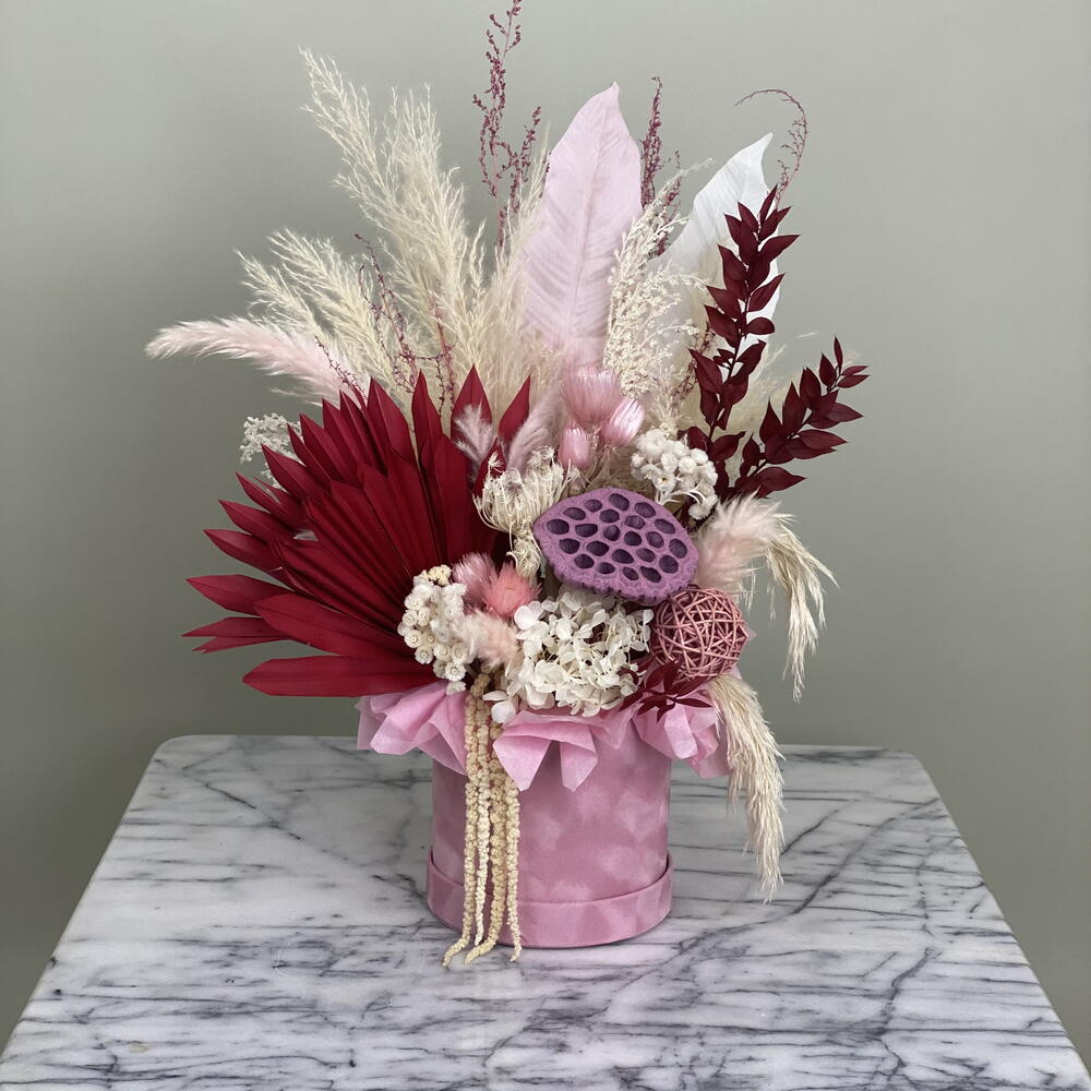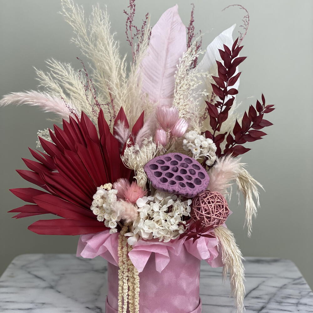 Dieses kunstvolle Blumenarrangement vereint elegante Trockenblumen in verschiedenen Rosé-, Creme- und Rottönen zu einer ausdrucksstarken Komposition. Die Kombination aus exotischen Palmblättern, zarten Federn, Pampasgras und dekorativen Elementen wie der pinkfarbenen Lotusfrucht und stabilisierten Hortensien verleiht dem Design eine moderne, zugleich romantische Note. 🌸 Besondere Merkmale: • Handgefertigt mit hochwertigen, langlebigen Trockenblumen • Farbpalette: Altrosa, Burgunderrot, Weiß – perfekt für stilvolle Innenräume • Edle Geschenkbox in Seidenoptik (rosa) inklusive • Kein Wasser notwendig – pflegeleicht und dauerhaft schön • Ideal als Geschenk oder stilvolle Tischdekoration