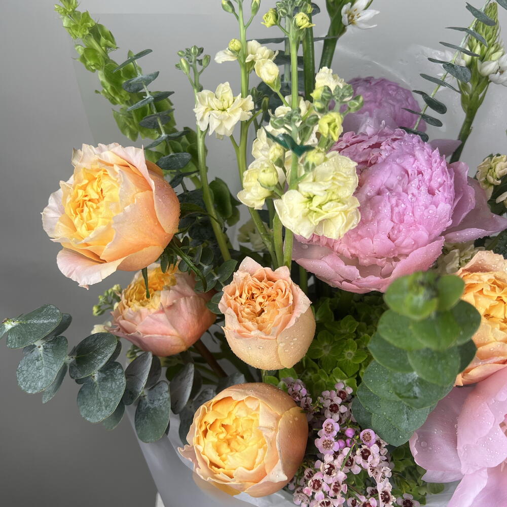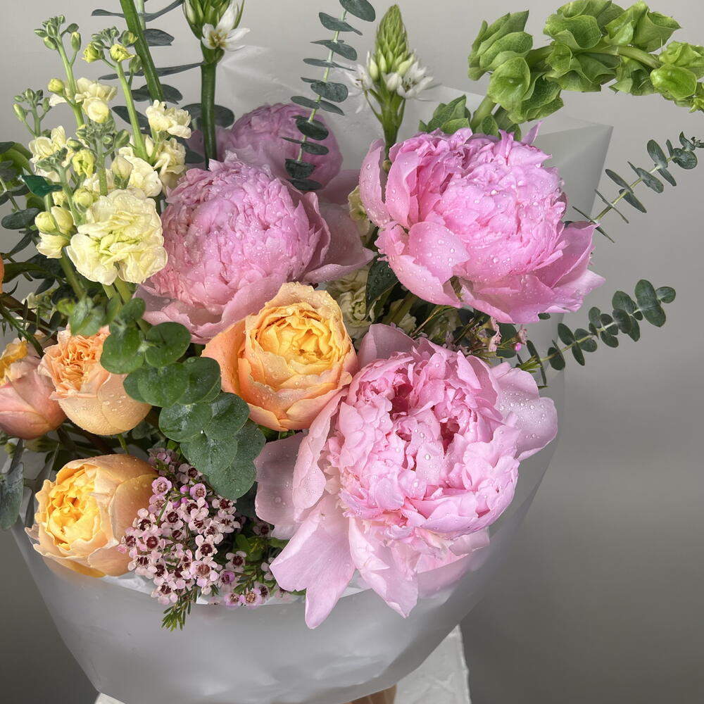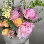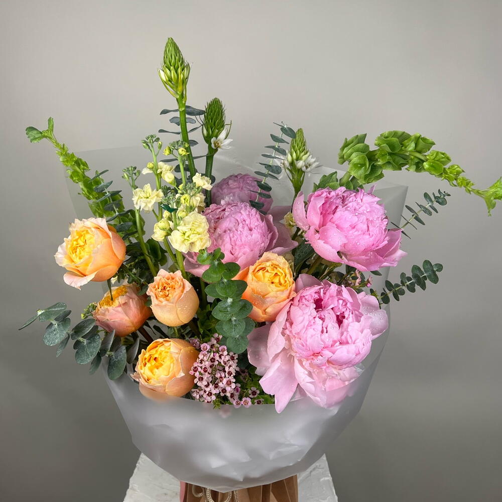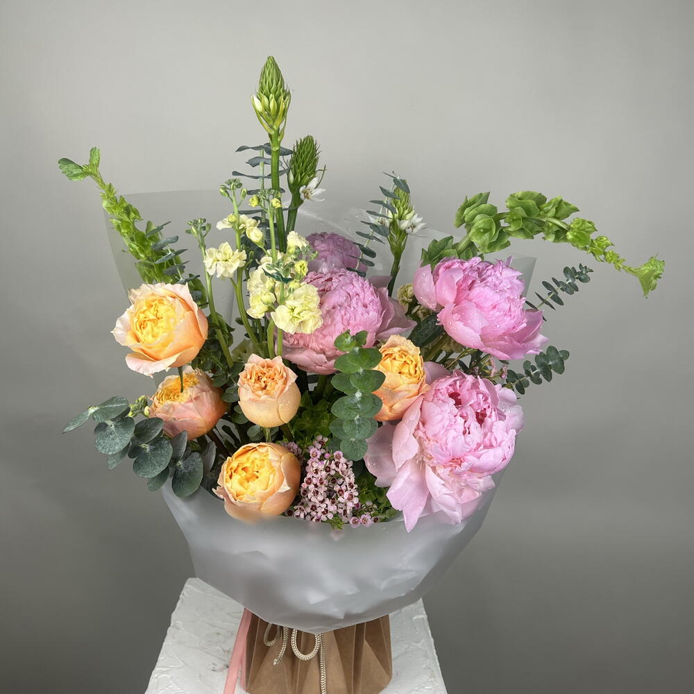 Hydrangea - 5 pcs peonies pink - 4 pcs garden roses - 5 pcs stock flowers - 4 pcs mix of greens - 1 pcs irish bells - 2 pcs star of bethlehem - 3 pcs