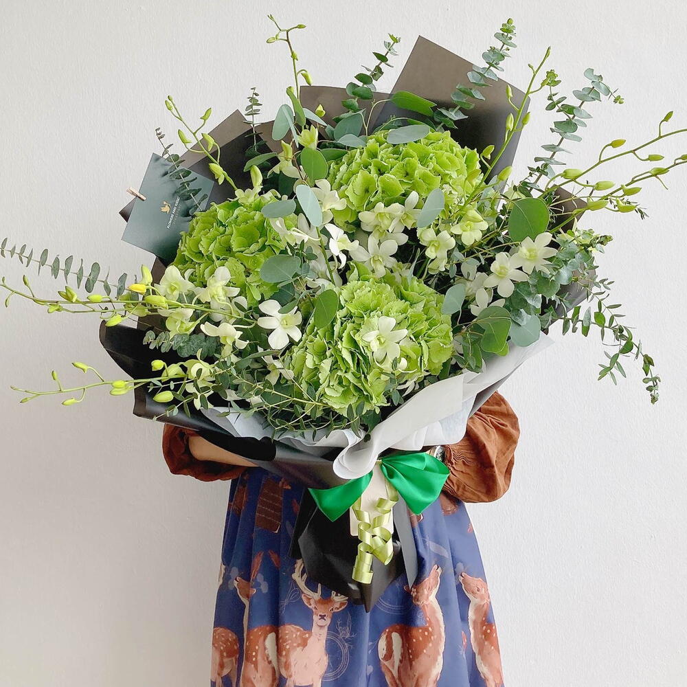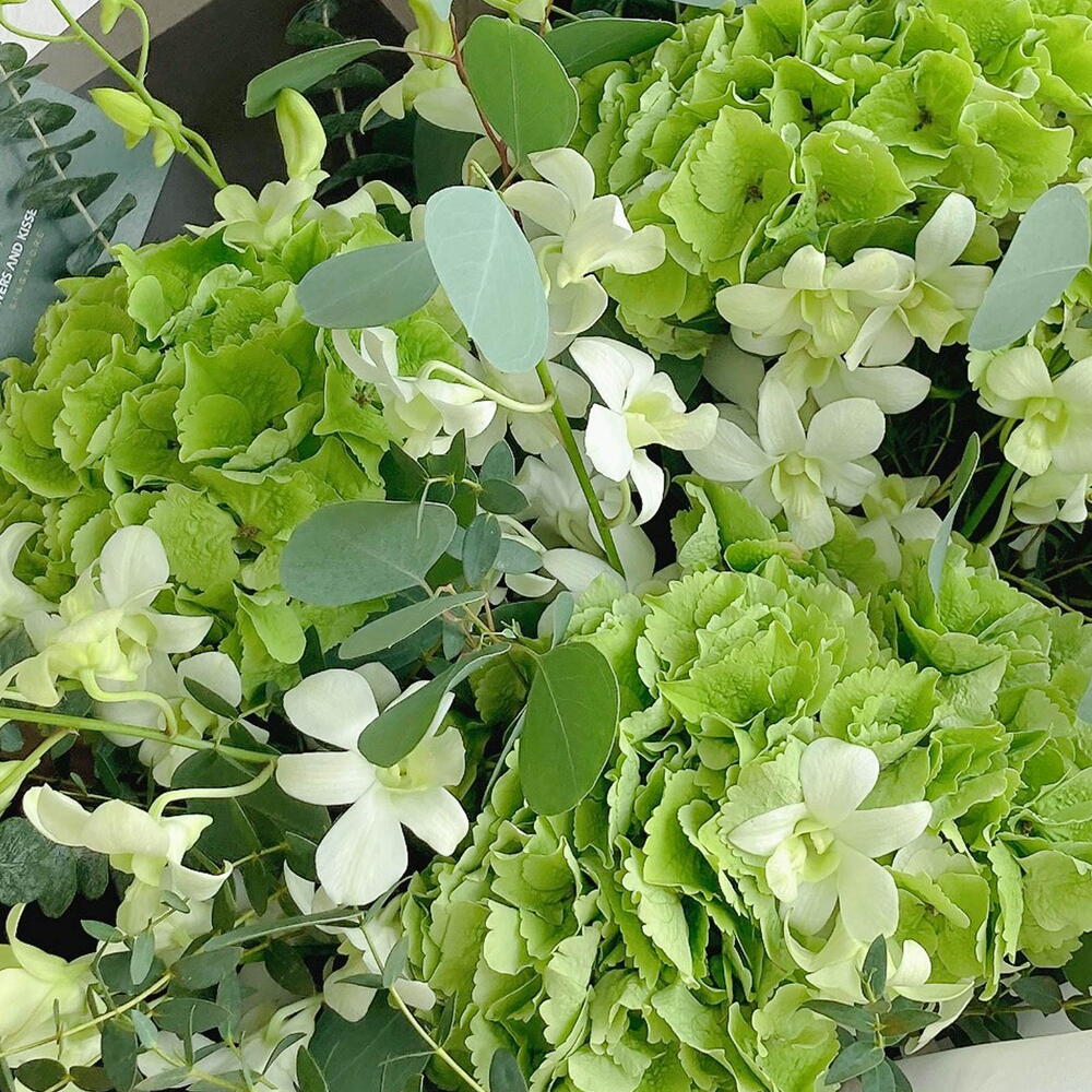 Flowers used: 3 Green Hydrangeas,White Orchids,Eucalyptus *Do note that our selection of flowers may exhibit peculiarities in shade and tone from picture references on this page. That is the beauty of nature! However, rest assured that colour themes and style will be in accordance with your choice.