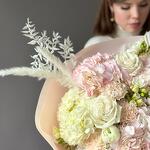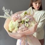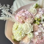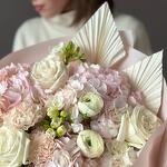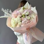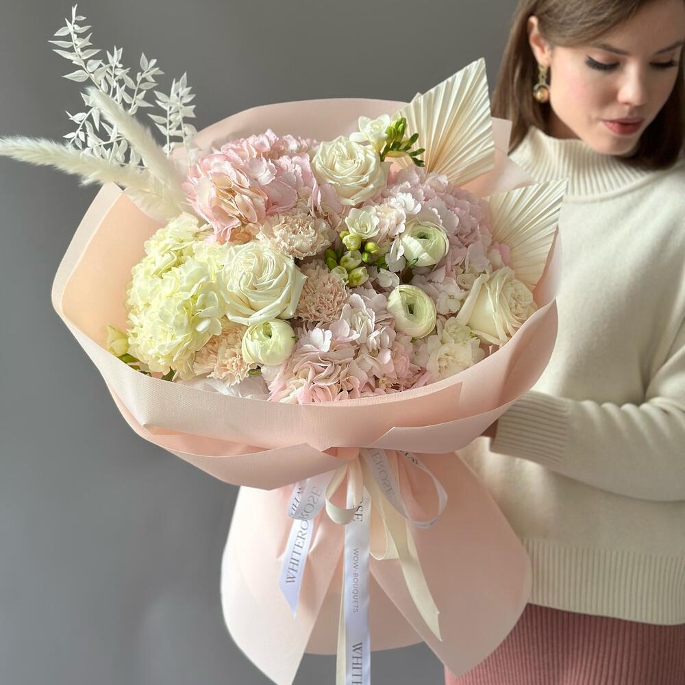 Hydrangea - 4 pcs Freesia - 5 pcs dianthus - 3 pcs ranunculus - 3 pcs dried palm leaves - 2 pcs roses - 3 pcs dried ruscus - 1 pcs dried cortaderia - 2 pcs