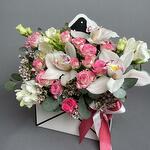 Ribbon - 2 pcs Eustoma - 1 pcs Freesia - 3 pcs Oasis - 1 pcs topper - 1 pcs cymbidium - 2 pcs wax - 1 pcs kobar rose - 1 pcs paper envelope - 1 pcs probier - 2 pcs