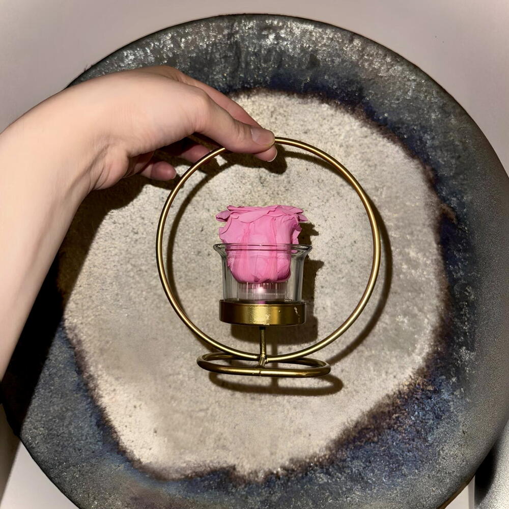 Eternal Ring of Love A stunning and real preserved pink rose encased in an elegant gold ring frame, designed to last up to 3 years. This timeless piece symbolizes everlasting love and adds a touch of sophistication to any space—a perfect gift for special moments or everyday romance.