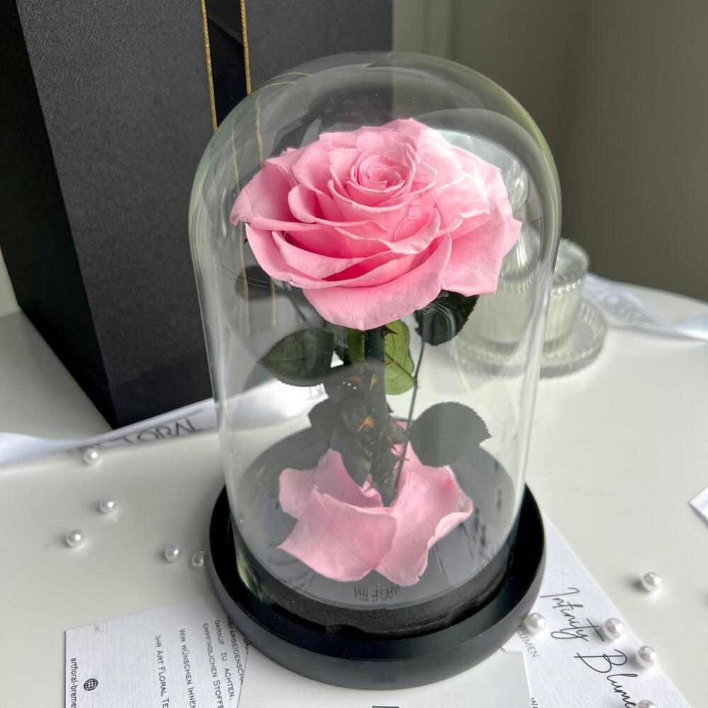 Tauchen Sie ein in die bezaubernde Welt unserer haltbaren Infinity Rose in zartem Rosa, präsentiert in einer anmutigen Glaskuppel, inspiriert von der zeitlosen Romantik von „Die Schöne und das Biest“. Diese fabelhafte Rose wird zu einem Symbol für Liebe und Zärtlichkeit, das über die Jahre hinweg strahlt. Die Infinity Rose wurde mit größter Sorgfalt ausgewählt und durch einen speziellen Konservierungsprozess bewahrt, um ihre Anmut und den zarten Rosaton für alle Zeiten zu bewahren. In einem sanften Rosa verkörpert diese Rose Romantik und Liebe, perfekt, um Gefühle der Zuneigung und Hingabe auszudrücken. Die Glaskuppel, die die Rose umgibt, verleiht dem Arrangement eine märchenhafte Note. Die transparente Kuppel schützt die Rose vor äußeren Einflüssen und bewahrt ihre Schönheit für die Ewigkeit. Das sorgfältig gestaltete Design erinnert an die romantische Atmosphäre von „Die Schöne und das Biest“ und verleiht Ihrem Raum eine Aura von zeitloser Liebe. Diese haltbare Infinity Rose in zartem Rosa eignet sich ideal als Geschenk für besondere Anlässe wie Valentinstage, Hochzeiten oder romantische Überraschungen. Sie symbolisiert nicht nur die Zartheit der Liebe, sondern auch die Beständigkeit schöner Erinnerungen. Verleihen Sie Ihrem Zuhause, Büro oder jedem anderen Raum mit dieser faszinierenden haltbaren Infinity Rose einen Hauch von romantischer Eleganz und zärtlichem Charme. Jetzt ganz bequem bestellen und an Ihre Wunschadresse liefern lassen.