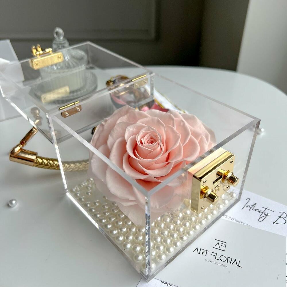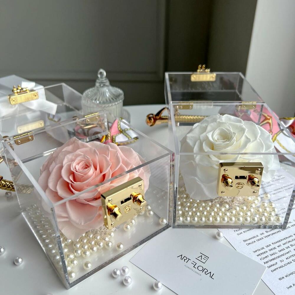 Ewige Rose im Acryl Cube Rosa: Der Acryl Cube Arrangements mit einer haltbaren Infinity Rose aus unserer Infinity Kollektion bestehen aus echten Blumen in höchster Qualität. Die Blumen wurden unter idealen Wetterbedingungen in der Äquatorregion gezüchtet. In der besten Blütezeit mühsam geschnitten, sortiert und einem komplizierten Konservierungsverfahren unterzogen, um Ihre ursprüngliche Schönheit über Jahre zu erhalten. Unsere Kompositionen aus haltbaren Blumen sind ein wundervolle Geschenke für den lieben Menschen und eine tolle Dekoration für jedes Interieur. Bei Art Floral achten ganz besonders auf die Qualität. Dabei legen wir bei unseren Bären den Wert auf jede einzelne Blume. Die Form, die Dichte der Blumen, der feste Sitz jeder einzelner Blume sind drei wichtigste Kriterien. Wir suchen außerdem permanent nach den letzten Trends im Bereich des Floristikdesigns und unsere Produkte sind die Reflexion davon. Bei der Herstellung verwenden wir nur besondere Blumen und die modernsten Materialien. Unser Team steckt besondere Liebe zum Detail in jedes Arrangement, deshalb finden Sie immer einen Sticker mit unserem Logo und ein Firmen Bändchen als Qualitätssiegel an jedem Produkt. Jetzt ganz bequem bestellen und an Ihre Wunschadresse liefern lassen.