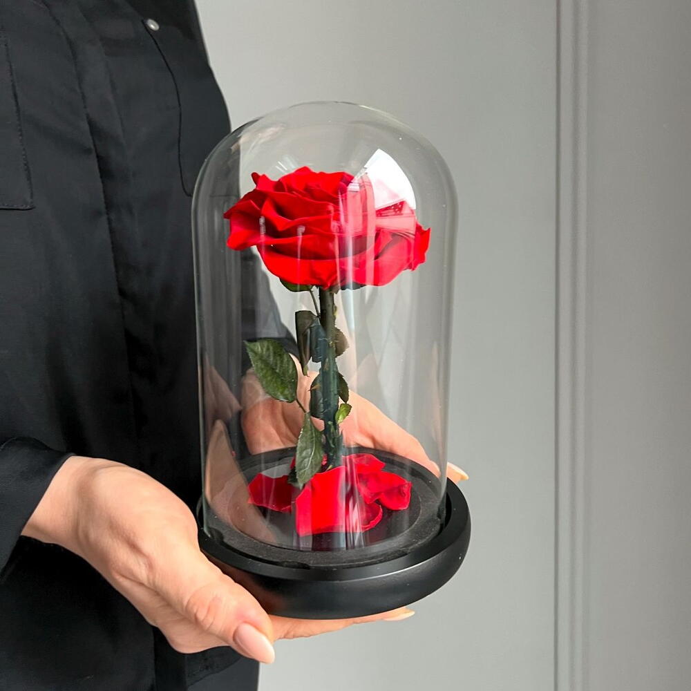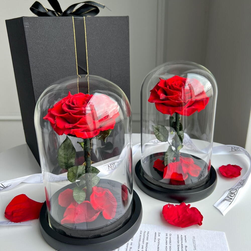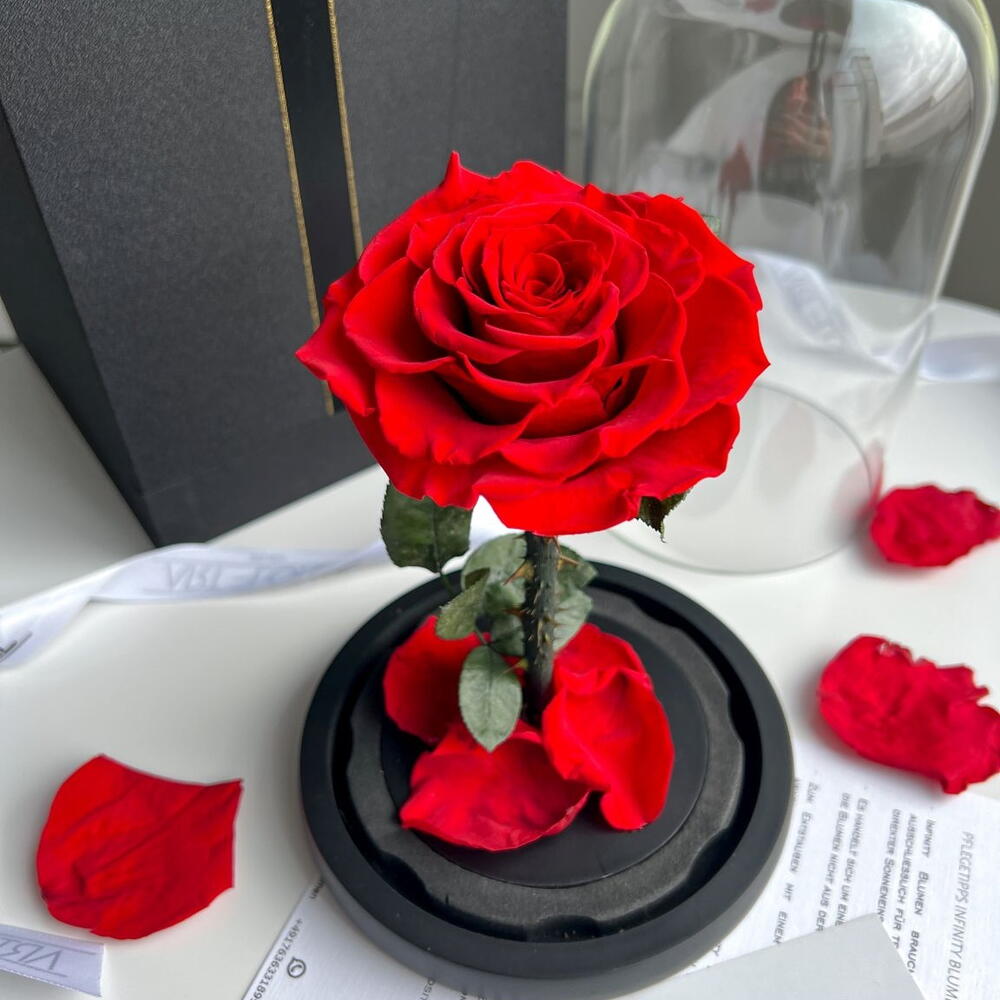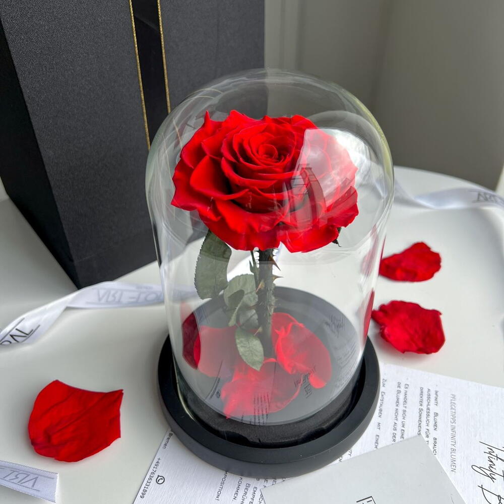 Ewige rote Rose im Glas. Inhalt: 1 x rote Rose am Stiel. Haltbarkeit: ca. 1-3 Jahre. Größe Kuppel: H22Ø15 cm Größe Rose: ca. 9 cm Ewige rote Rose im Glas. Tauchen Sie ein in die zeitlose Eleganz unserer haltbaren Infinity Rose in leidenschaftlichem Rot, präsentiert in einer zauberhaften Glaskuppel – inspiriert von der Magie von „Die Schöne und das Biest“. Diese wunderschöne Rose wird zu einem Symbol unvergänglicher Liebe und Schönheit, die für immer währt. Die Infinity Rose wurde mit größter Sorgfalt ausgewählt und durch einen speziellen Konservierungsprozess konserviert, um ihre Frische und Anmut über die Zeit hinweg zu bewahren. In einem tiefen, lebendigen Rot strahlt diese Rose Sinnlichkeit und Romantik aus – perfekt, um Gefühle der Liebe und Hingabe auszudrücken. Die Glaskuppel, die die Rose umgibt, verleiht dem Arrangement eine märchenhafte Note. Die transparente Kuppel schützt die Rose vor äußeren Einflüssen und bewahrt ihre Schönheit für die Ewigkeit. Das sorgfältig gestaltete Design erinnert an die ikonische Szene aus „Die Schöne und das Biest“ und verleiht Ihrem Raum eine Aura von Märchenzauber. Diese haltbare Infinity Rose eignet sich ideal als Geschenk für besondere Anlässe wie Jubiläen, Hochzeiten oder Valentinstage. Sie symbolisiert nicht nur zeitlose Liebe, sondern auch die Unvergänglichkeit schöner Erinnerungen. Verleihen Sie Ihrem Zuhause, Büro oder jedem anderen Raum mit dieser faszinierenden haltbaren Infinity Rose einen Hauch von zeitloser Eleganz und Romantik. Jetzt ganz bequem bestellen und an Ihre Wunschadresse liefern lassen.