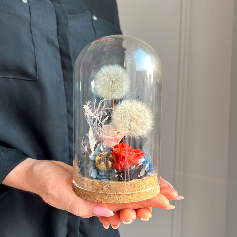 Entdecken Sie den Zauber der Natur in einem einzigartigen, zeitlosen Arrangement. Diese wunderschöne Glaskuppel beherbergt einen atemberaubenden, ewigen Blumentraum, der Ihre Sinne verzaubert. Die Komposition aus sorgfältig konservierten Blumen in kräftigen Rottönen, zarten Hortensienblüten in Pastellfarben, weichen Pampasgrashalmen und den goldenen Löwenzahnblüten erschafft ein harmonisches Gesamtbild voller Eleganz und Natürlichkeit. Jedes Element wurde mit Liebe zum Detail ausgewählt und konserviert, um seine Schönheit über Jahre hinweg zu bewahren. So können Sie sich immer wieder an diesem einzigartigen Arrangement erfreuen, ohne dass die Blüten verwelken. Die handgefertigte Glasglocke mit Korkboden umschließt die Komposition und verleiht ihr einen geschützten, schwebenden Charakter. Platziert an einem hellen Ort, fängt das Licht die Farben und Formen auf zauberhafte Weise ein. Highlights: Handgefertigte Glasglocke mit Korkboden Blumenkomposition aus konservierten Rosen, Hortensien, Pampasgras und Löwenzahnblüten Haltbarkeit von ca. 1-3 Jahren Maße: Höhe 17,5 cm, Durchmesser 10 cm Lassen Sie sich von diesem ewigen Blumentraum verzaubern und verleihen Sie Ihren Räumen einen besonderen Hauch von Natur und Schönheit. Ein einzigartiges Geschenk, das Freude bereitet und lange anhält. Jetzt ganz bequem bestellen und an Ihre Wunschadresse liefern lassen.