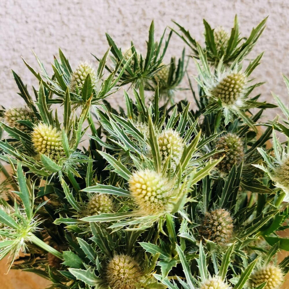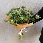 A bold and striking bouquet featuring 9 stems of exotic Eryngium, also known as Sea Holly — admired for its architectural spiky texture and distinctive silvery-green tones. Wrapped in natural kraft paper and tied with a crisp white ribbon, this unconventional yet captivating arrangement is a perfect choice for those who appreciate wild, nature-inspired beauty with a modern edge.