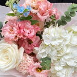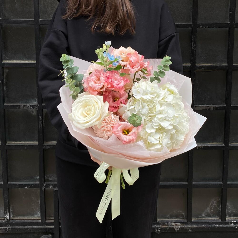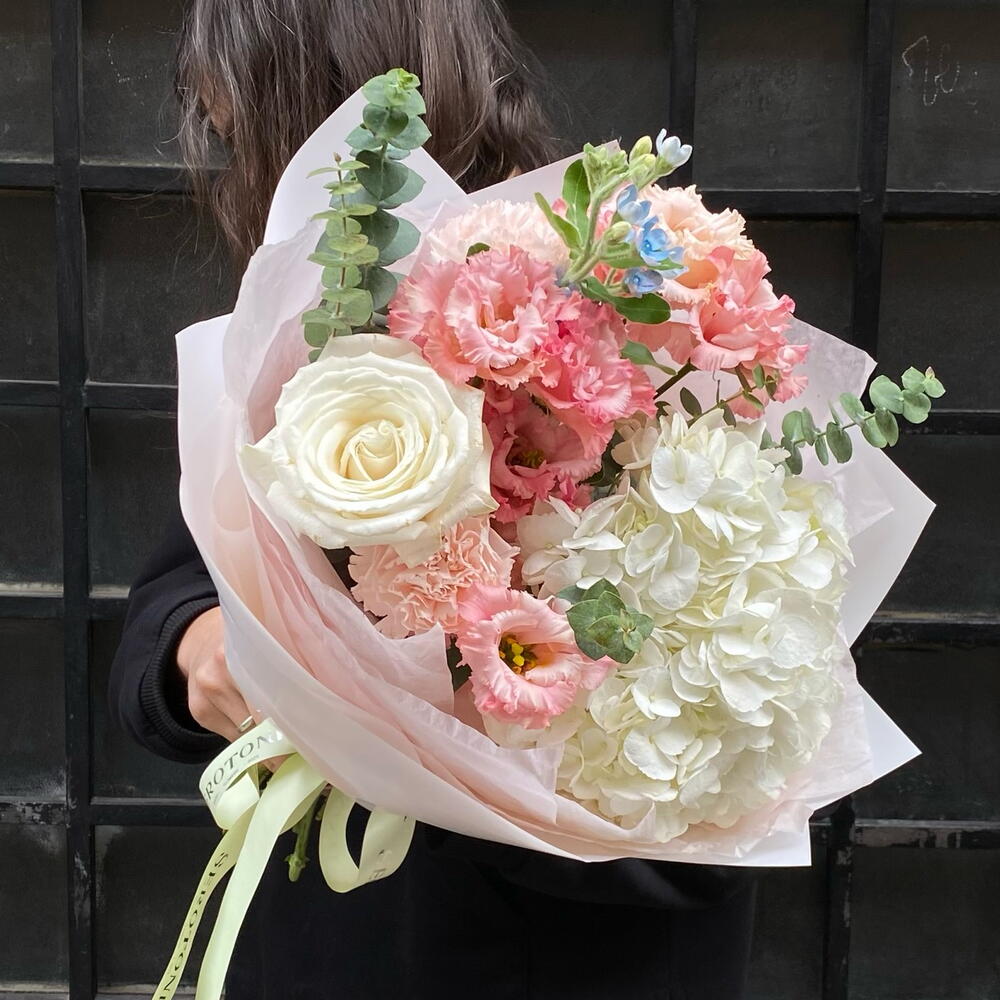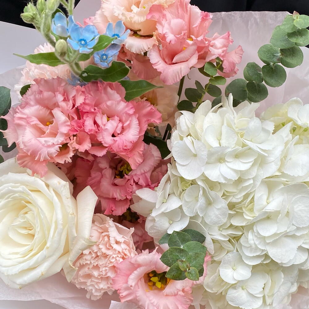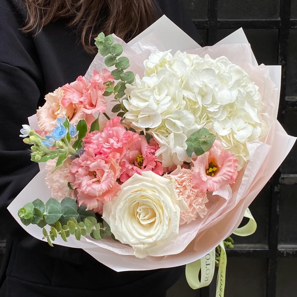 Eustoma - 2 pcs Eucalyptus - 1 pcs hydrangea - 1 pcs rose - 1 pcs dianthus - 2 pcs oxypetalum - 1 pcs