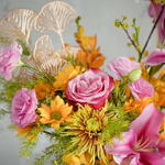 pink lilies - 4 pcs yellow chrysanthemums - 6 pcs pink roses - 6 pcs yellow orchids - 4 pcs