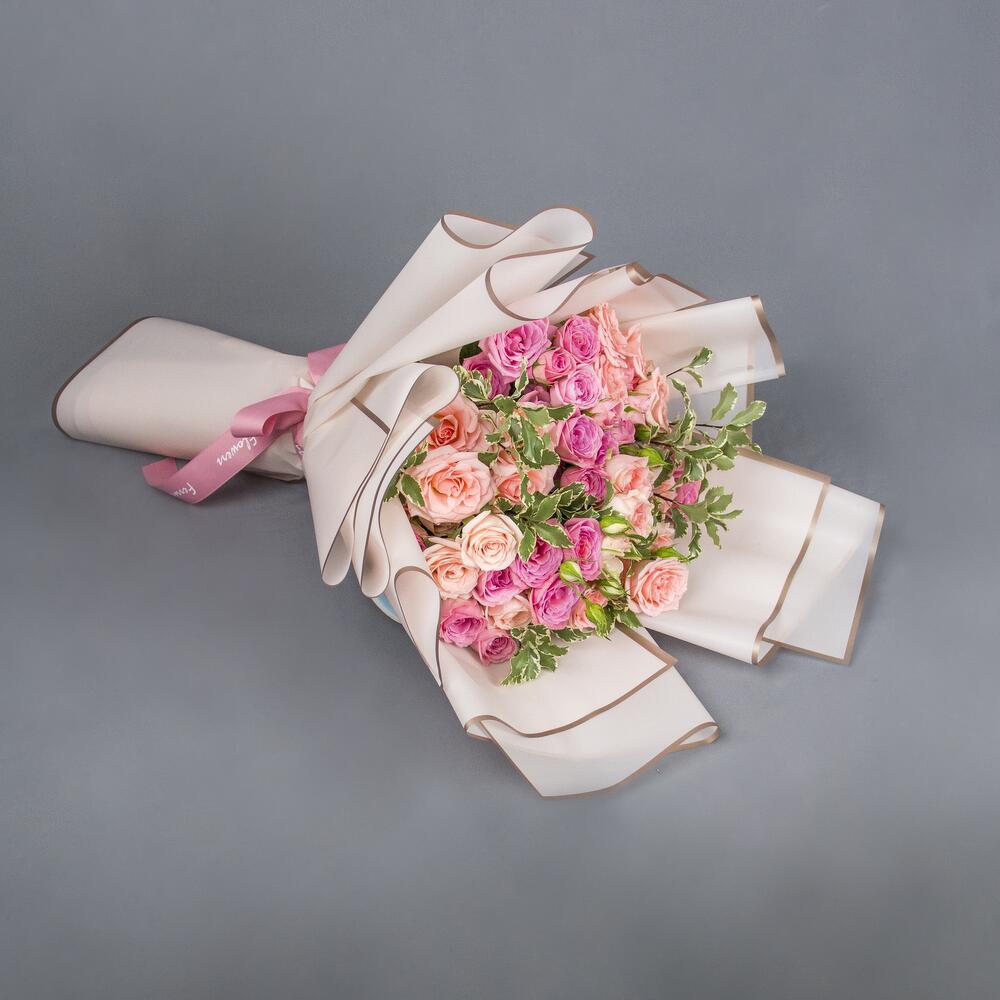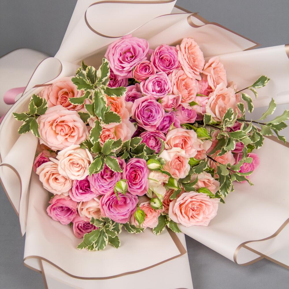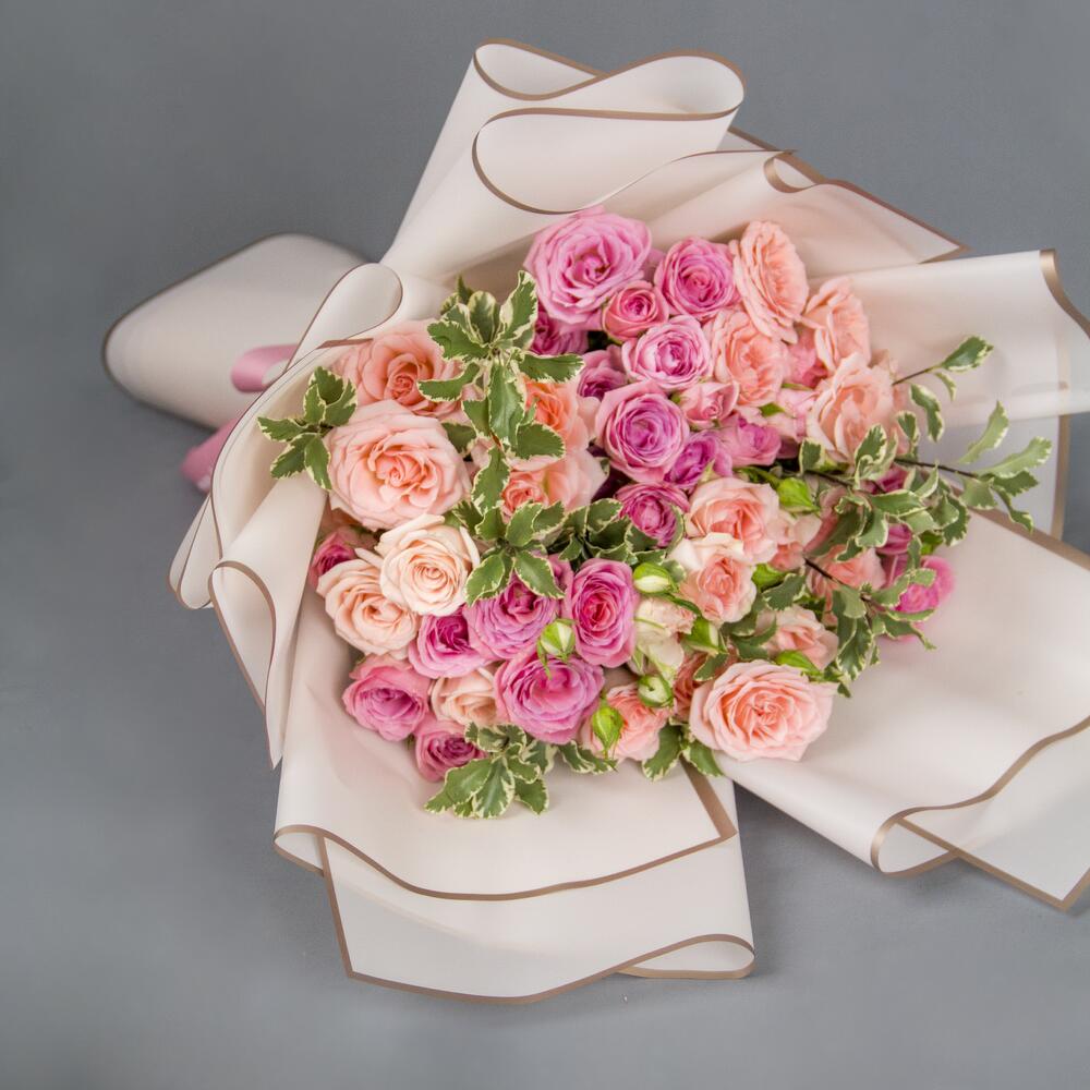 Ribbon - 1 pcs Spray rose - 10 pcs Wrapping - 5 pcs Green leaves - 5 pcs