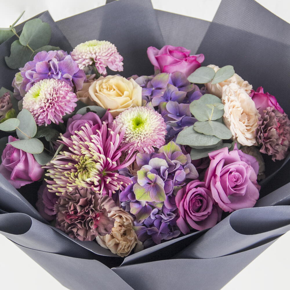 A hand hand bouquet of chrysanthemum, carnations, hydrangea and roses
