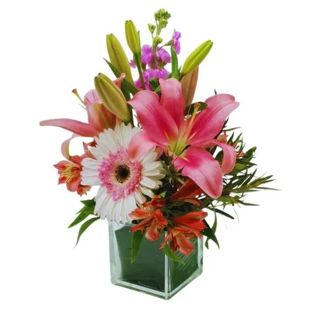Arreglo de liliums, gerberas, rosas y demas flores de estación en tono rosado en florero de vidrio. Incluye florero de vidrio de 10 x 10 cm.