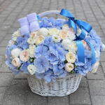 Delight in the elegance of this exceptional Flowers in a Basket arrangement, composed of 11 tender-hearted Lisianthus blooms, 7 spectacular blue hydrangeas, 20 majestic roses, and 15 charming garden babe roses. Carefully nestled together in a bespoke basket, these flowers come together to create an enchanting symphony of color, texture, and aroma. This arrangement is perfect for filling any space with a touch of serenity, grace, and beauty making it an ideal gift for any occasion or a luxurious centerpiece for every setting.