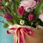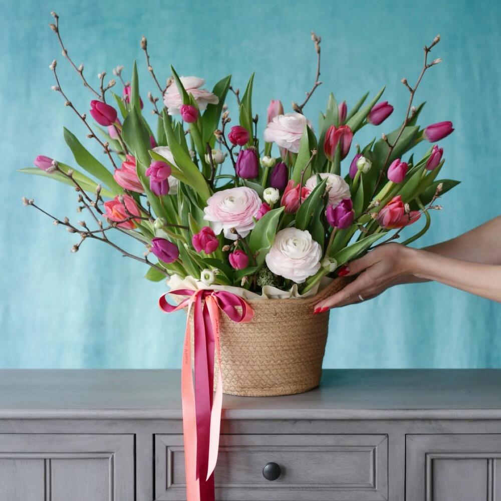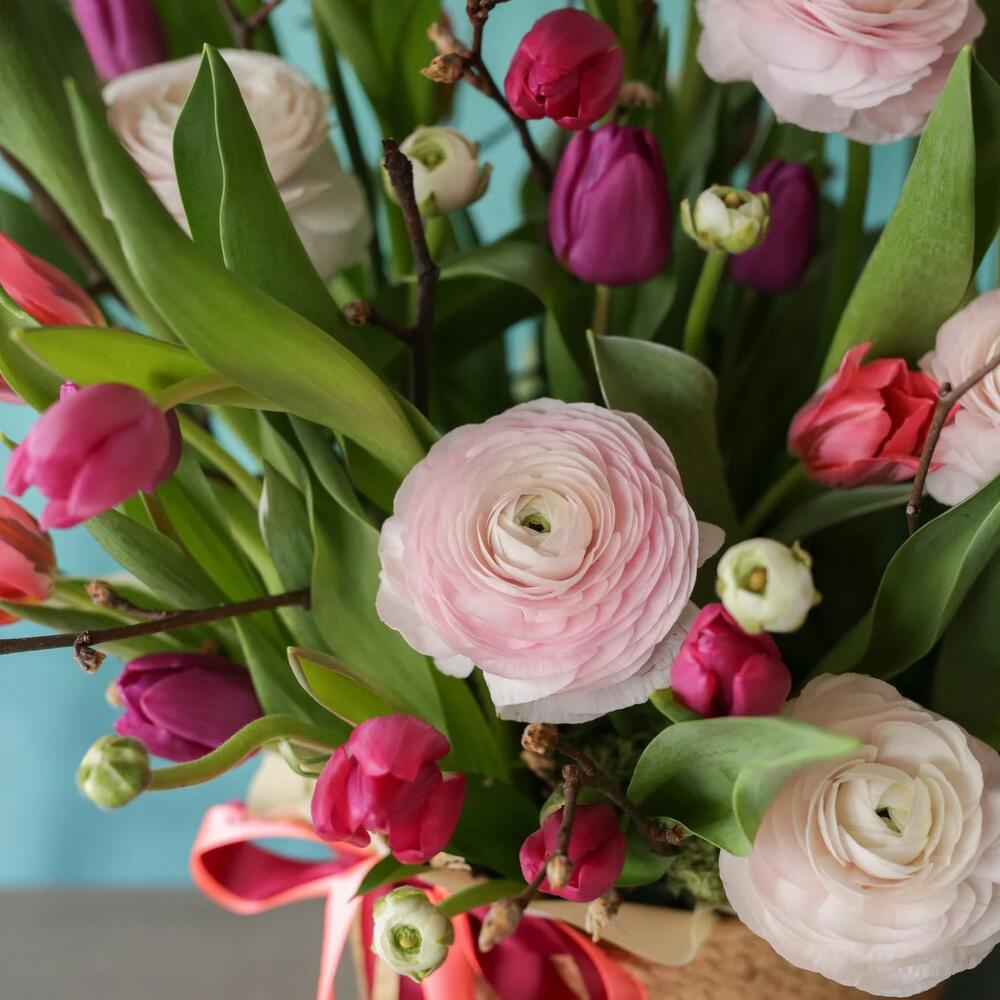 Tulips - 25 pcs ranunculus - 6 pcs cherry blossoms - 5 pcs