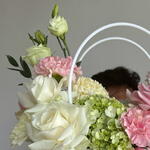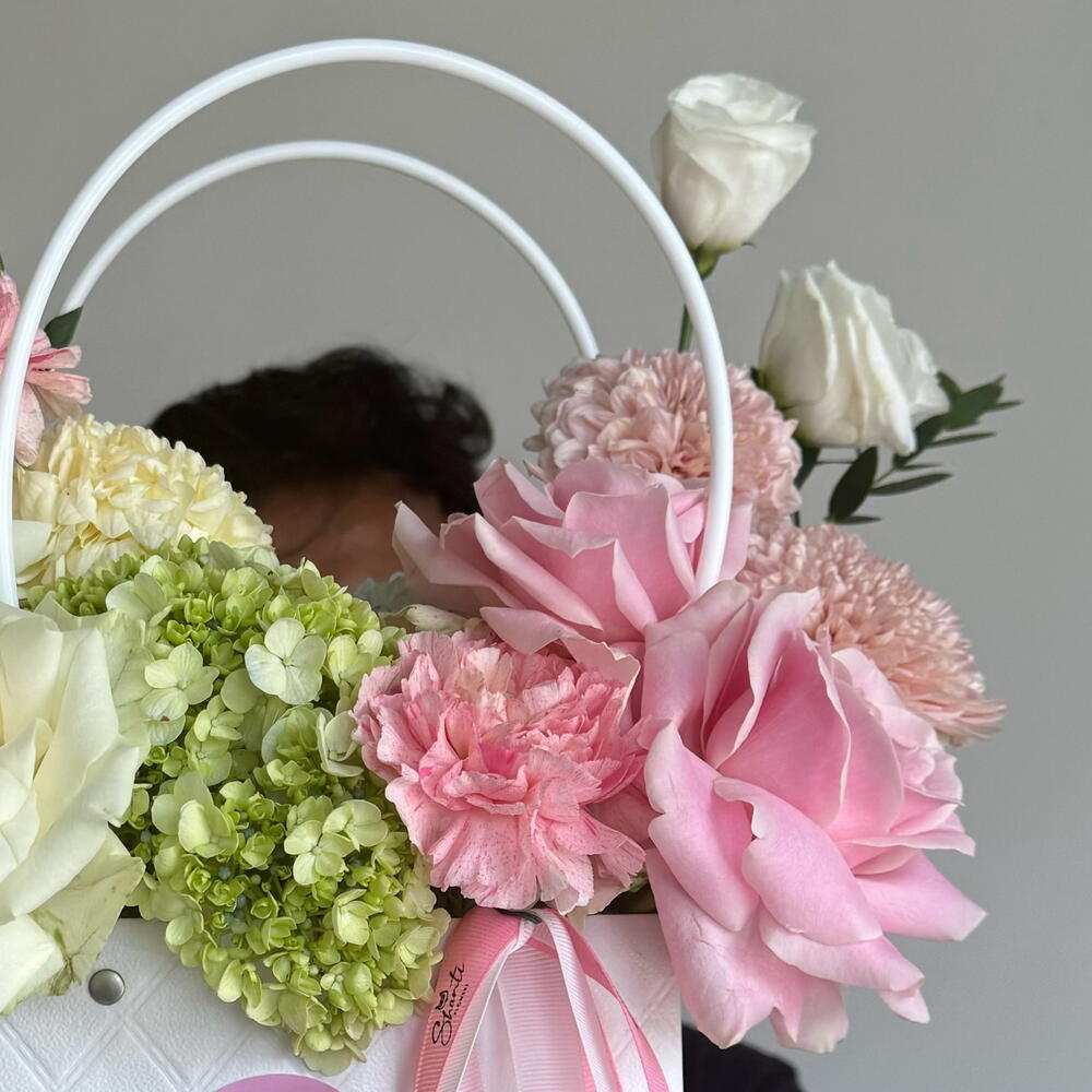 Eucalyptus - 2 pcs pink carnations - 2 pcs green hydrangea - 1 pcs cream carnation - 1 pcs pink roses - 2 pcs white roses - 3 pcs pink ball chrysanthemum - 2 pcs