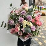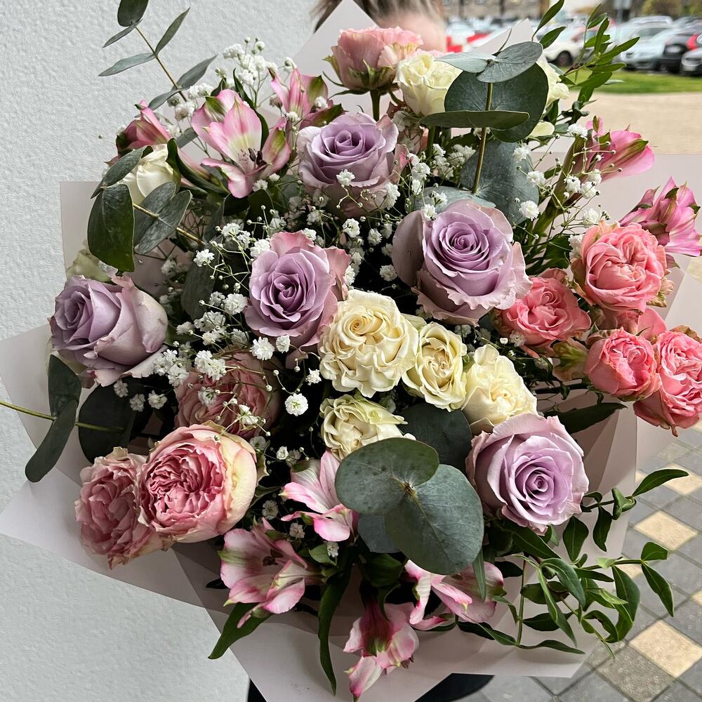 Eucalyptus - 3 pcs Alstroemeria - 3 pcs Pistacia - 5 pcs rose - 5 pcs rose spray - 7 pcs gypsophila flower - 2 pcs decorative paper liston - 1 pcs