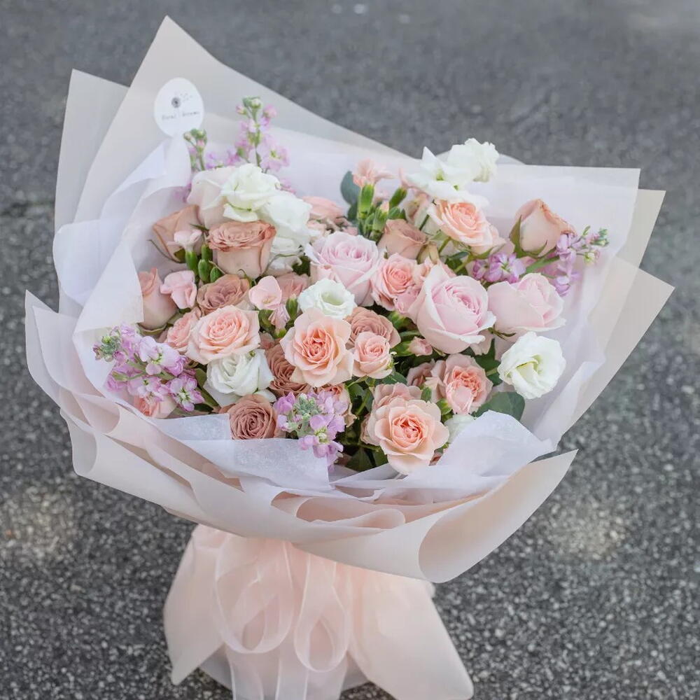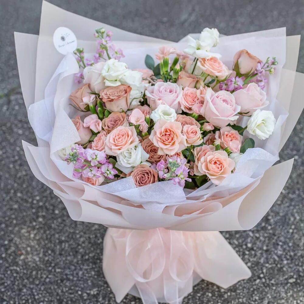 This exquisite bouquet from our Florists Specials range is a captivating infusion of delicate elegance and vibrant charm. Composed of 5 pieces of aromatic Mattiola that enhance alluring undertones, 10 pieces of refreshing eucalyptus leaves to balance the vibrancy, along with a romantic medley of 12 pieces of pristine white roses symbolizing unblemished love. Adding to this symphony of colors, we have 6 pieces of blush pink roses signifying admiration and grace, and 8 pieces of peach roses infusing a touch of gratitude and warm sentiments. This bouquet is indeed a spectacular floral carnival embodying myriad emotions in a stunning arrangement.