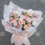 Маттиола - 5 pcs eucalyptus leaves - 10 pcs peach roses - 12 pcs white roses - 6 pcs blush pink roses - 8 pcs