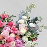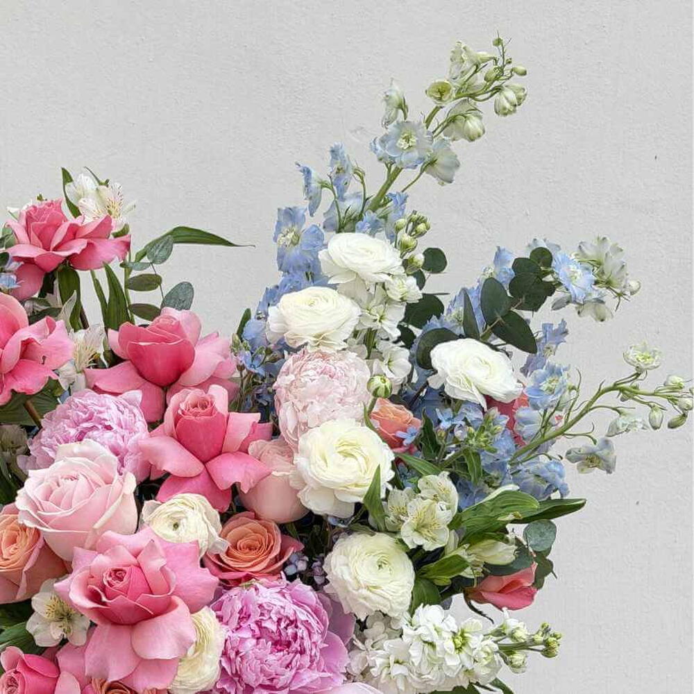 Peony - 2 pcs delphinium - 6 pcs pink roses - 15 pcs peach roses - 7 pcs raninculus - 8 pcs