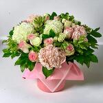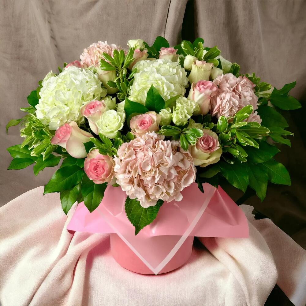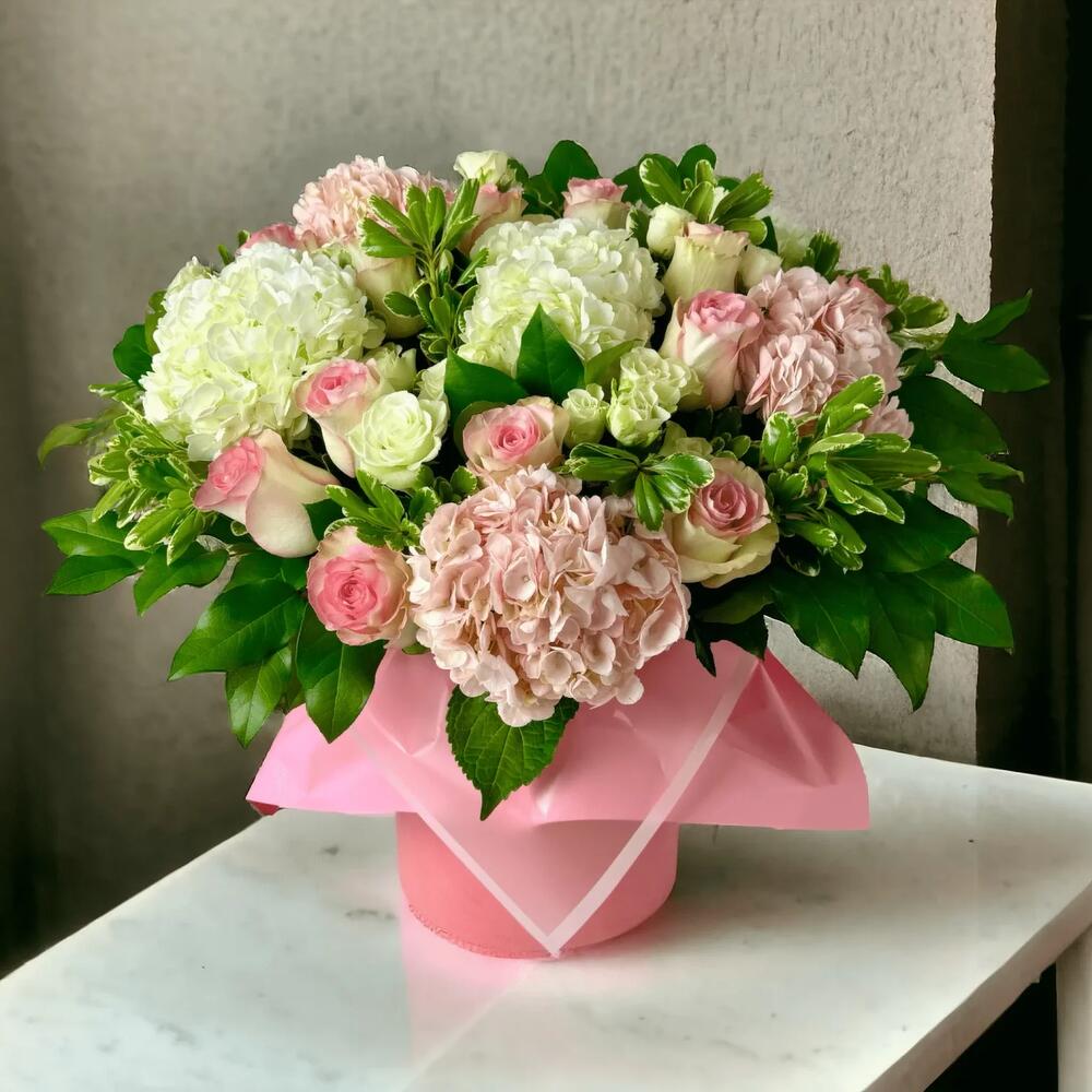 Introducing the Flower Box Allure, floral arrangement beautifully encased in a chic floral hat box. What’s inside: Pink and white hydrangeas Delicate pink roses