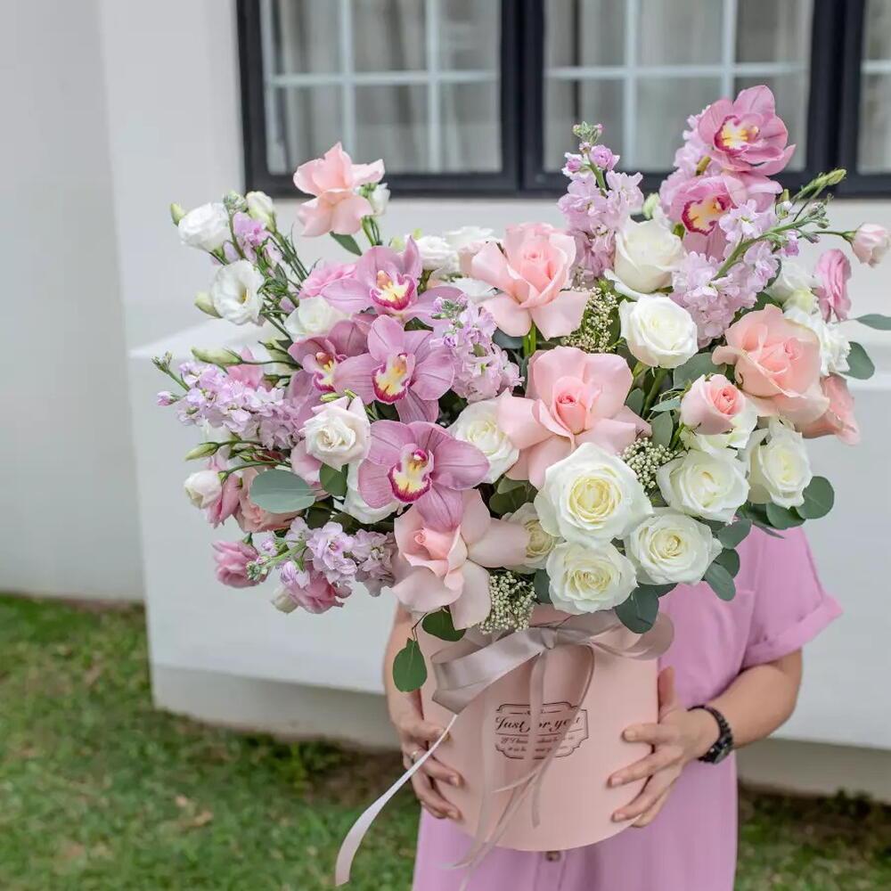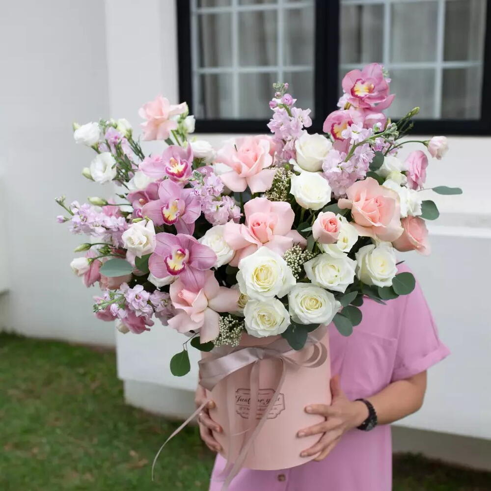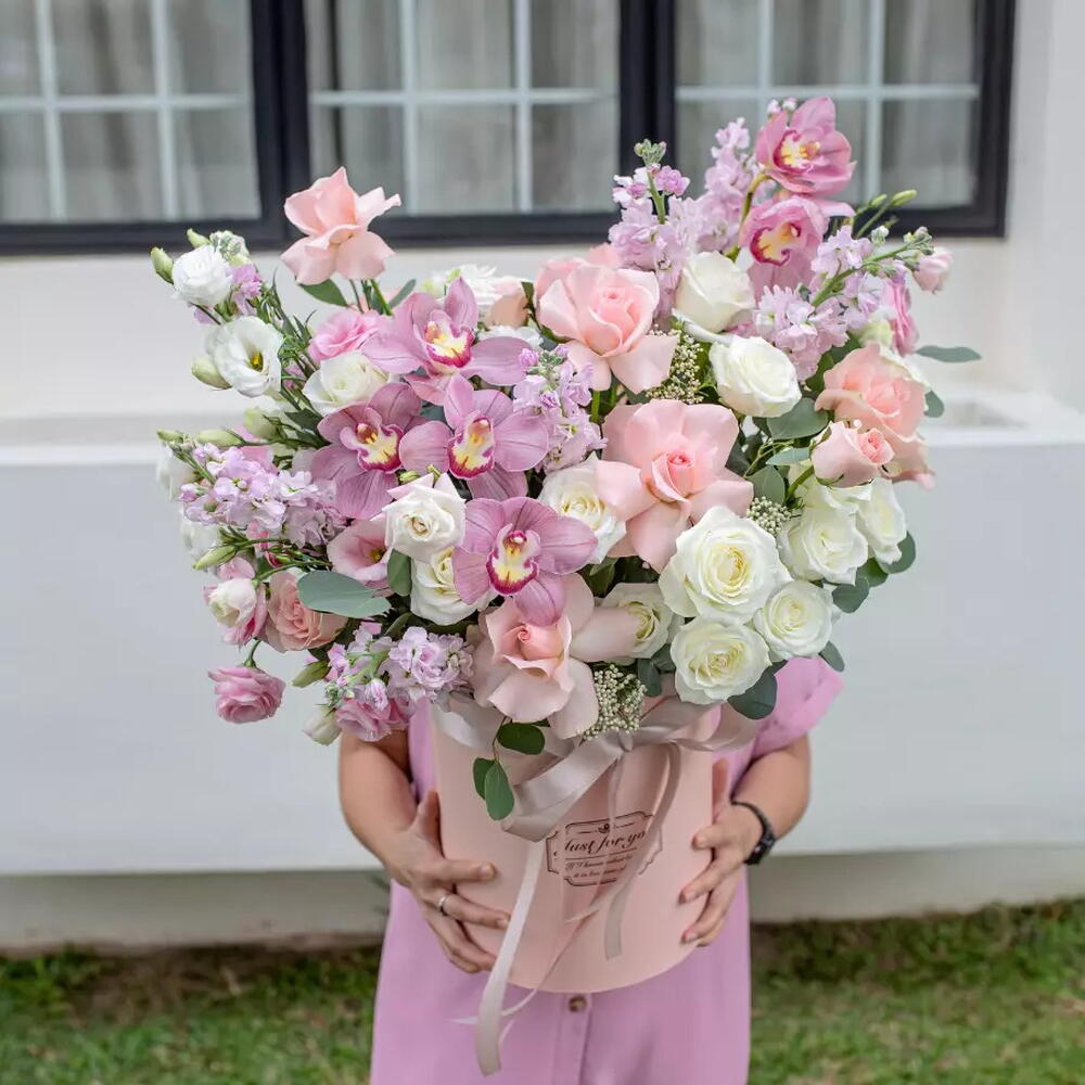 This exquisite Flowers in a Box arrangement is an ethereal blend of grace and charm, composed of 5 Eustomas, 5 Matthiolas, 12 white roses, 10 blush pink roses, and 5 Lavender Cymbidium Orchids. The variety of blossoms come together to create a symphony of colors and fragrances, promising to brighten any space and uplift the spirit. This luxurious and charming floral arrangement is a picture-perfect gift for special occasions or just to make an everyday setting extraordinary.