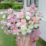 Eustoma - 5 pcs matthiola - 5 pcs white roses - 12 pcs blush pink roses - 10 pcs lavender cymbidium orchid - 5 pcs