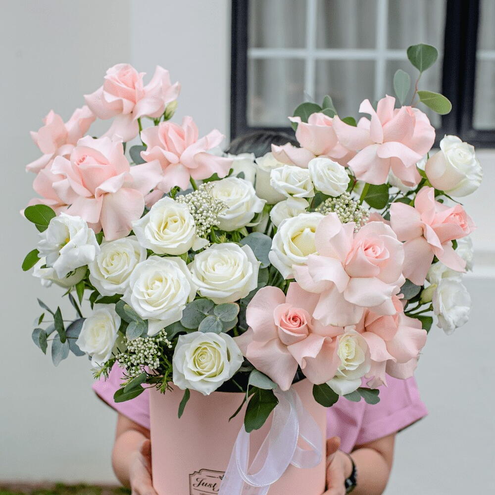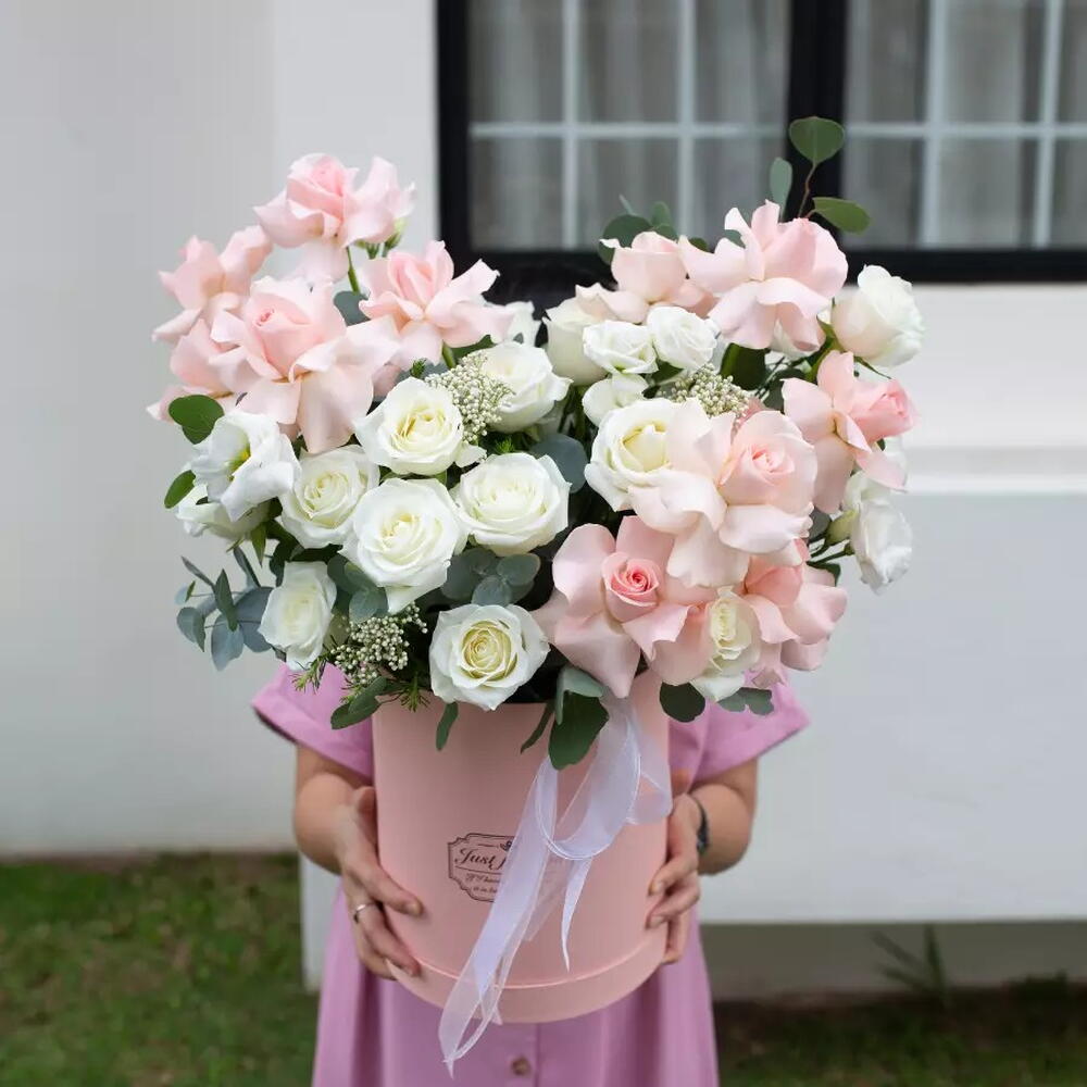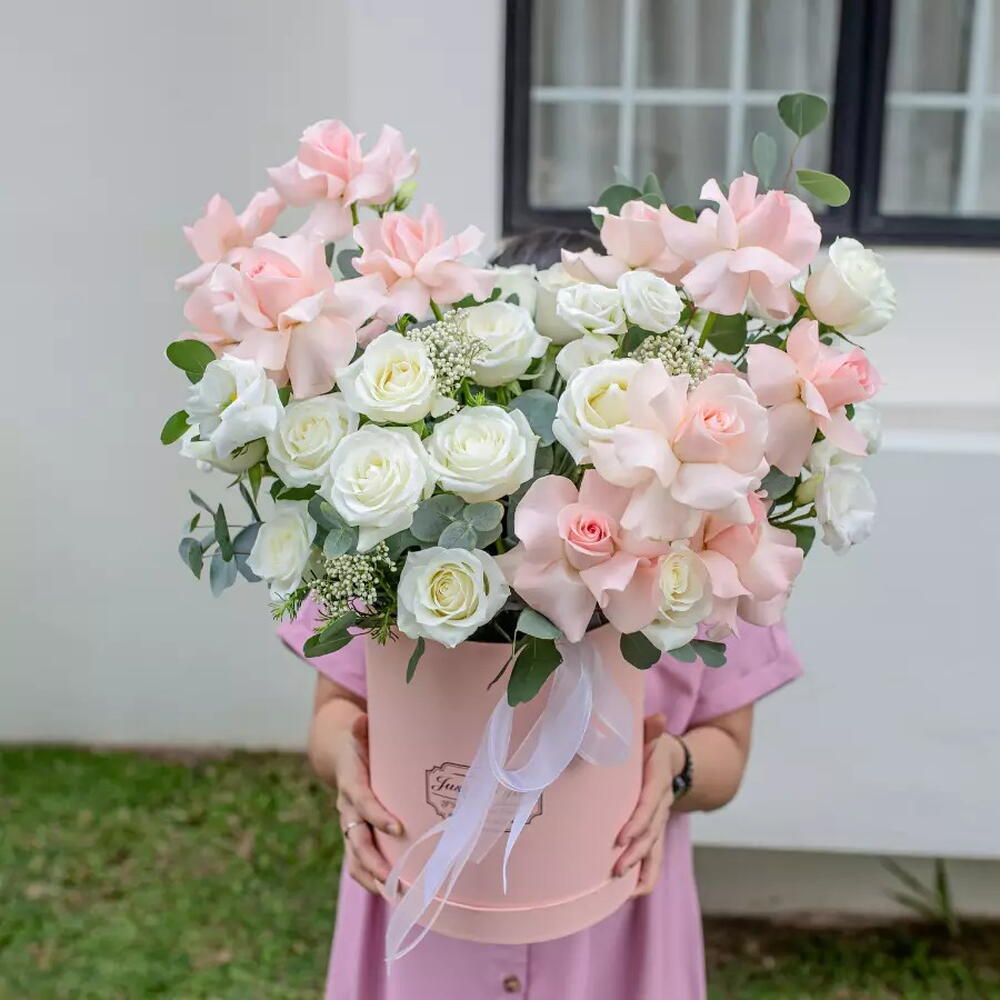 Immerse yourself in the exquisite world of elegance and charm with this delicate array of Flowers in a Box. Blooming with five graceful Eustomas, four sprigs of ethereal Caspia, fourteen pristine White Roses, and ten Blush Pink Roses, this arrangement is a harmonious symphony of beauty and serenity. Embrace the waltz of colors and fragrances and invite romance and tranquility into your life. Whether youre celebrating a special occasion or simply seeking a touch of elegance, this floral masterpiece is sure to enchant. The perfect expression of affection and sophistication - the Flowers in a Box collection.
