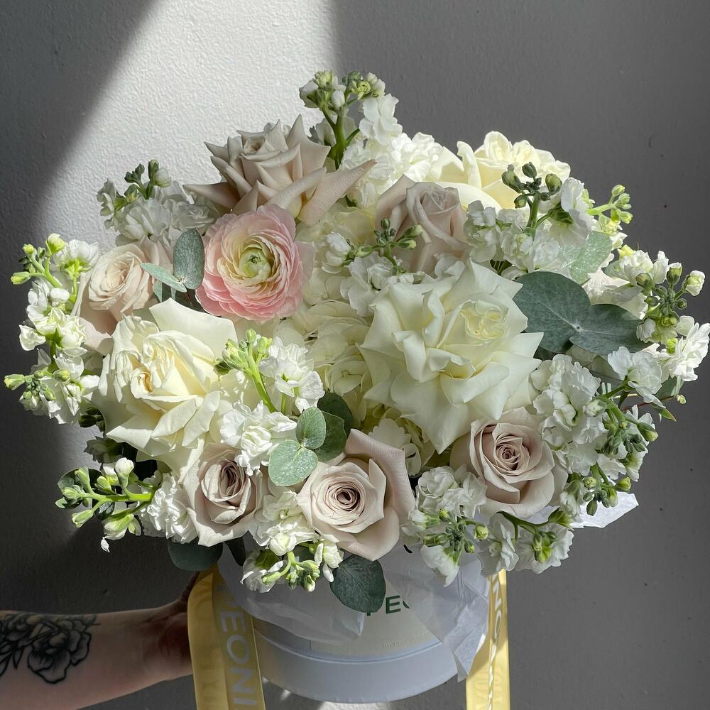 Indulge in the vibrant beauty of this stunning Flowers in a Box assortment. This enchanting collection comprises of airy hydrangeas, three in number, nestled among a lavish array of 15 delicate stocks. Also included in this eye-catching array are 15 exquisite roses, selected for their premium quality and arresting allure, along with 5 eclectic ranunculuses. Altogether, this cornucopia of blossoms makes a wonderful addition to any decor setting or a heartfelt gift.