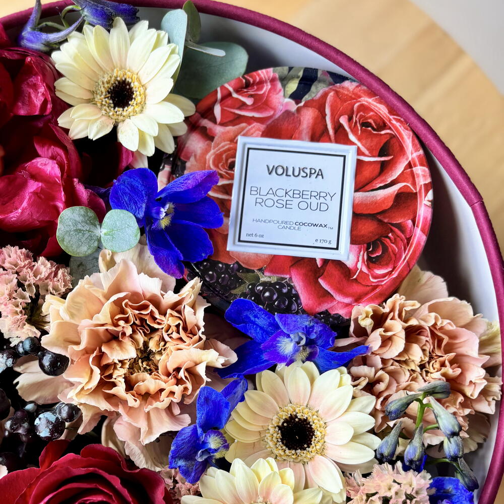 Statice - 4 pcs Eucalyptus - 5 pcs rose - 1 pcs box m - 1 pcs dianthus - 5 pcs peon - 2 pcs gerber - 4 pcs berries decorativas - 2 pcs soy wax candle voluspa - 1 pcs