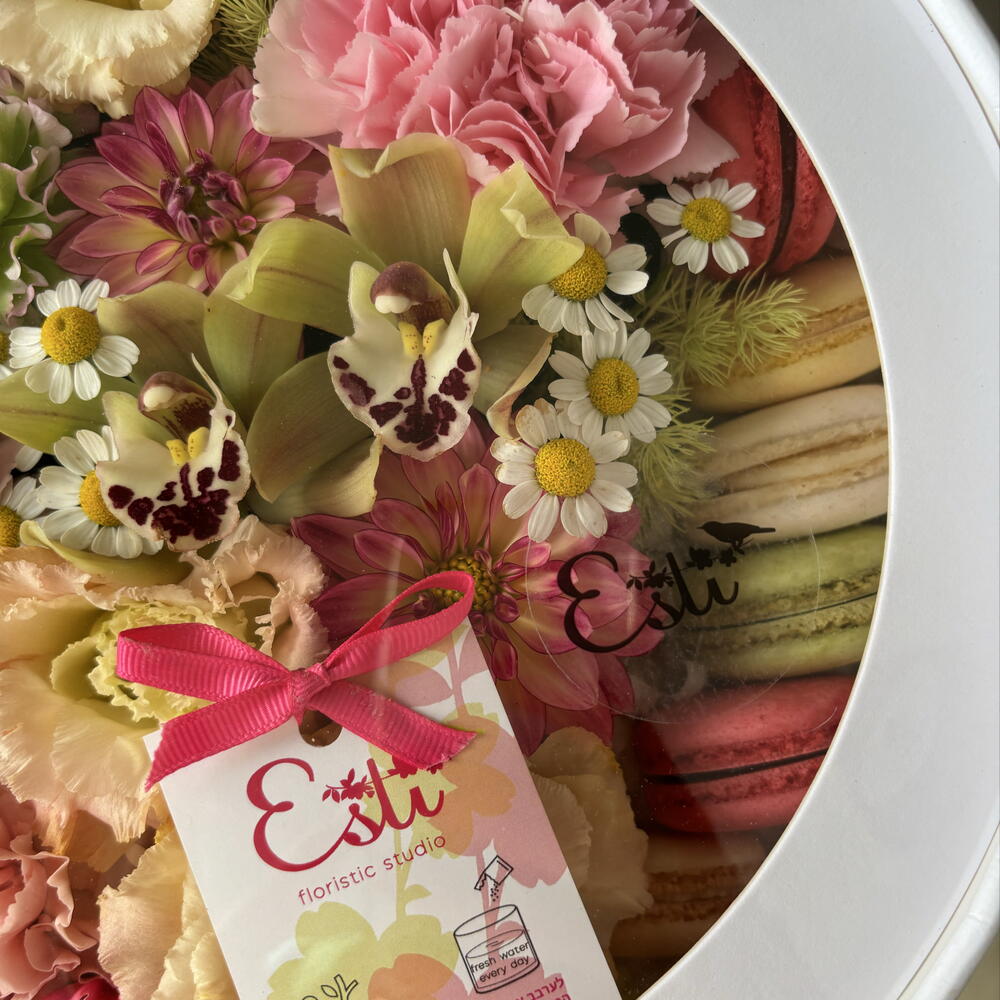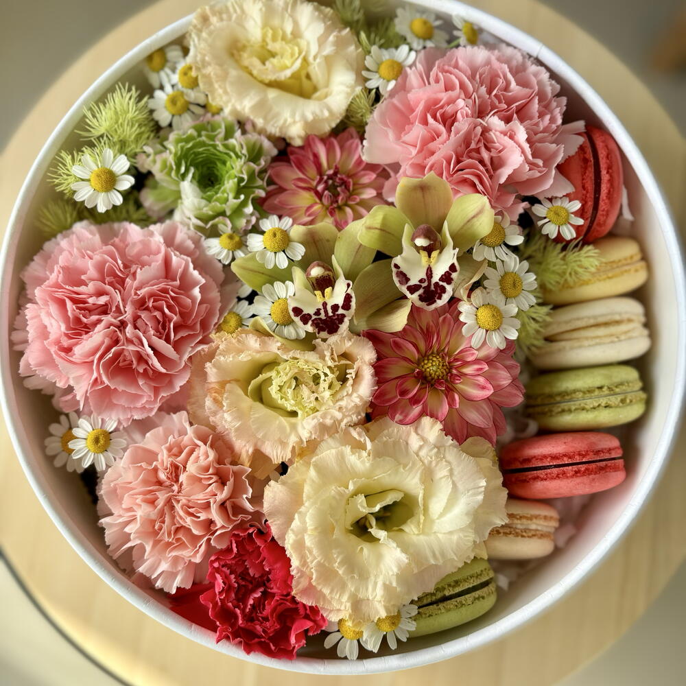 dianthus - 4 pcs camomile - 2 pcs dry flowers - 1 pcs lizijantus - 2 pcs dahila - 3 pcs box with window size m - 1 pcs different colors macaroons - 7 pcs